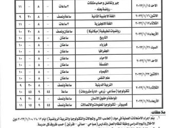 جدول امتحانات الفصل الدراسي الأول للمرحلة الابتدائية.