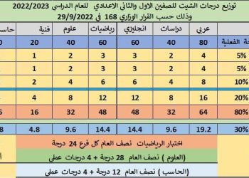 توزيع درجات اسئلة امتحانات الصف الأول والثاني الاعدادي 2023 كل المواد