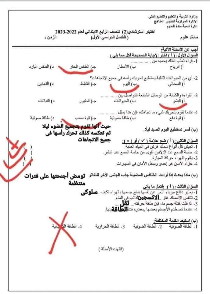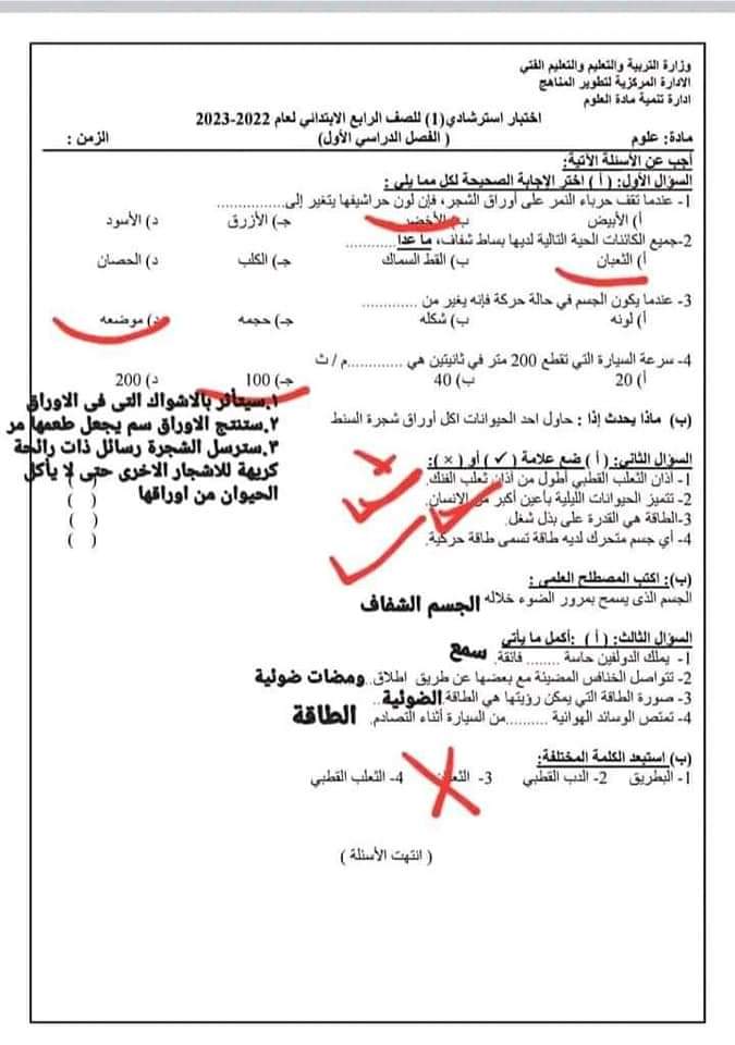 إجابة النماذج الاسترشادية مادة العلوم الصف الرابع الابتدائي الترم الاول 2023