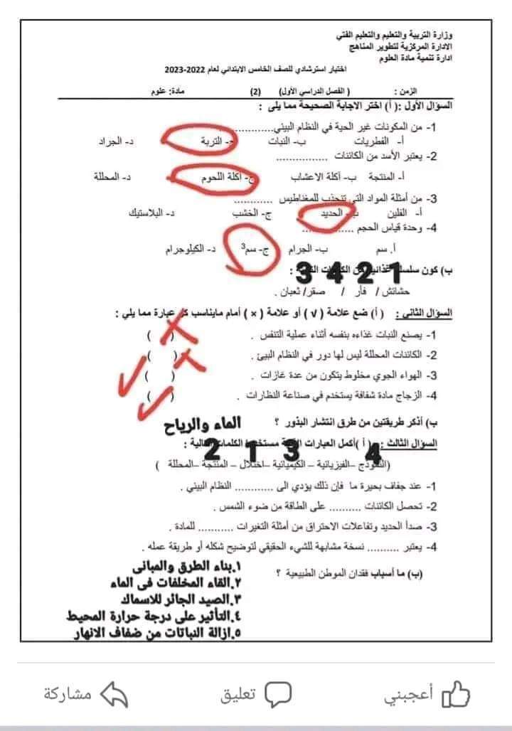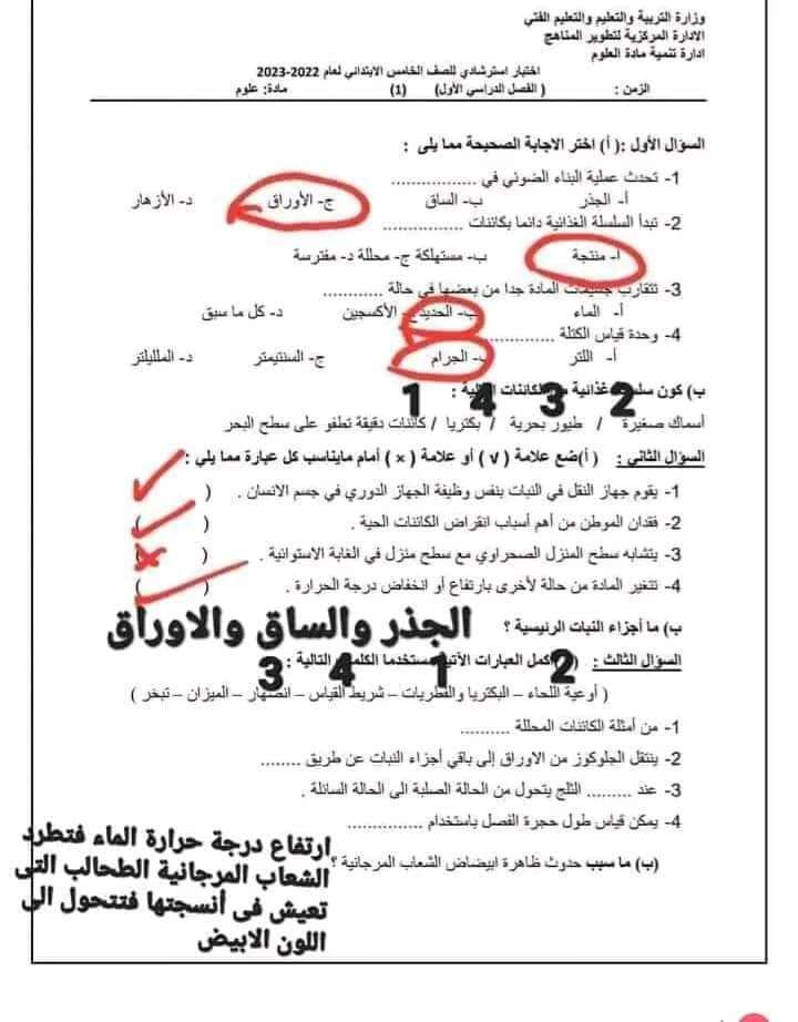 إجابة النماذج الاسترشادية مادة العلوم الصف الخامس الابتدائي الترم الاول 2023