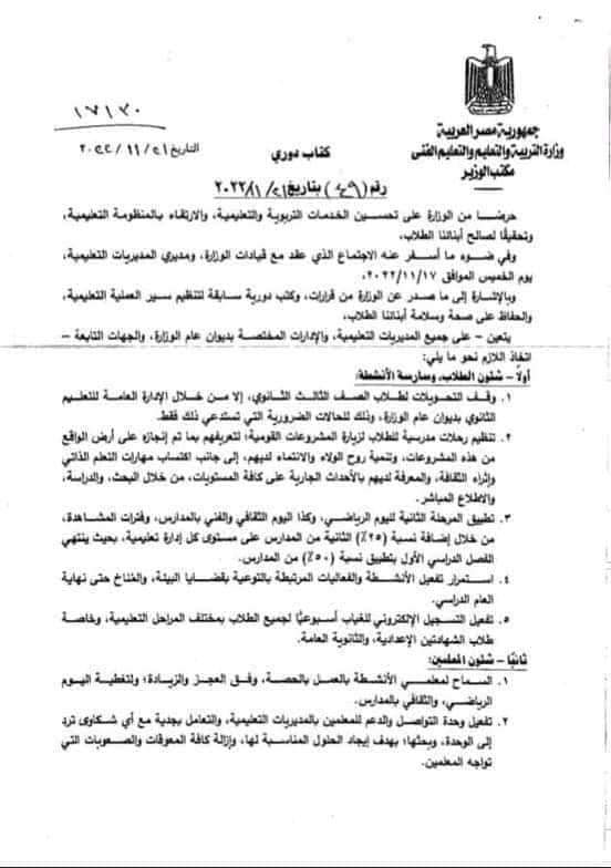 وضعت وزارة التربية والتعليم، الصيغة النهائية الخاصة بامتحان الفصل الدراسى الأول للصفين الأول والثاني الثانوي لعام 2022-2023.