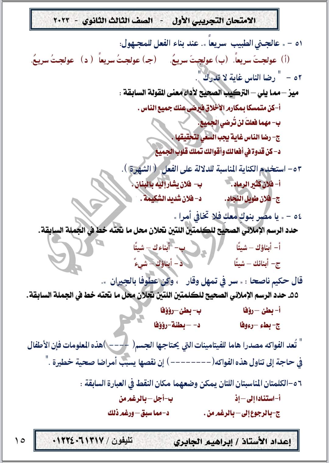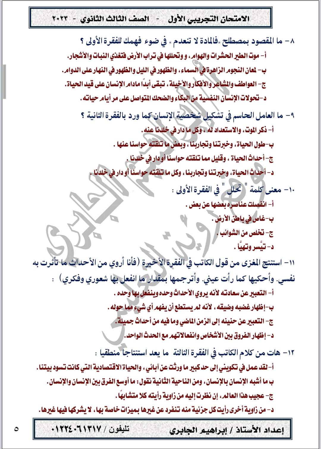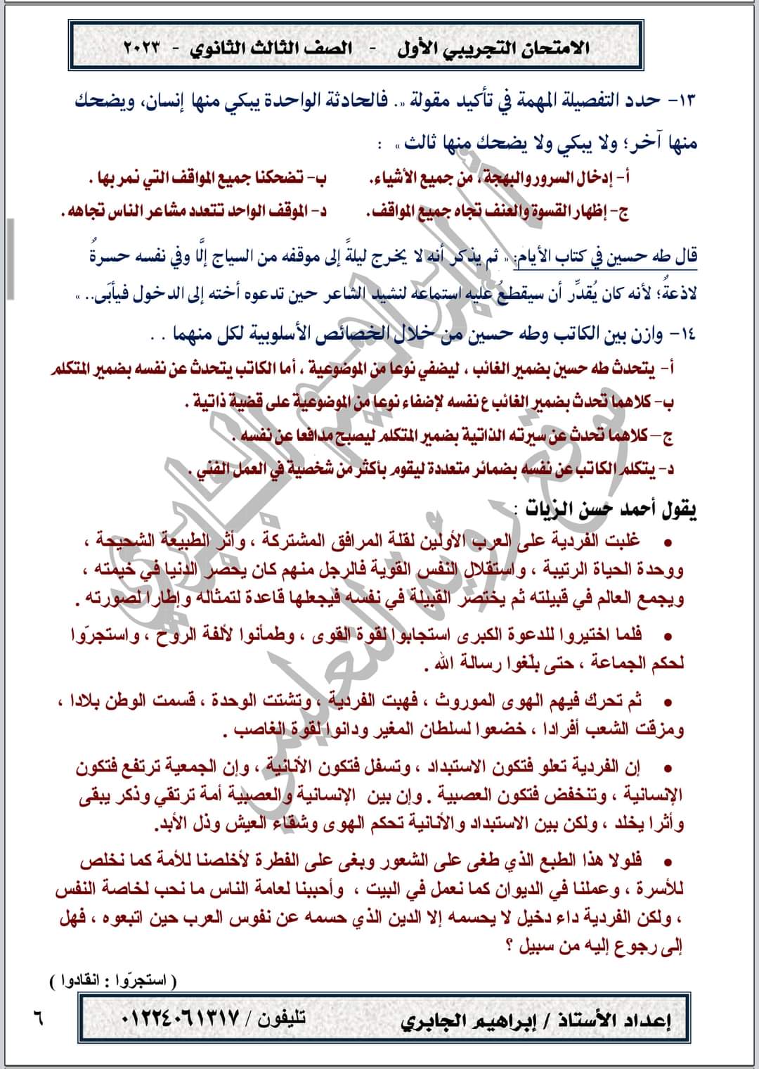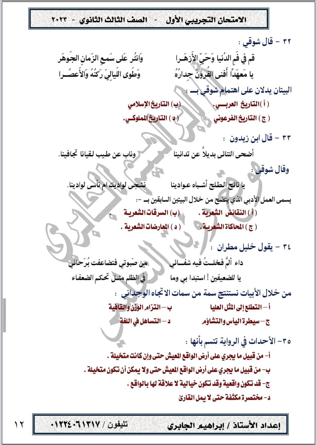 تحميل امتحان تجريبي في مادة اللغة العربية حسب المواصفات الجديدة الصف الثالث الثانوي 2023