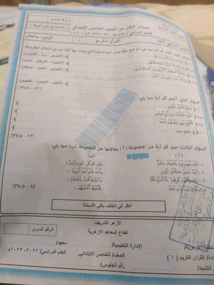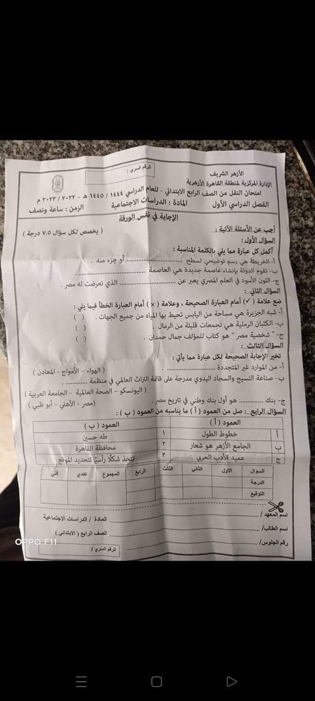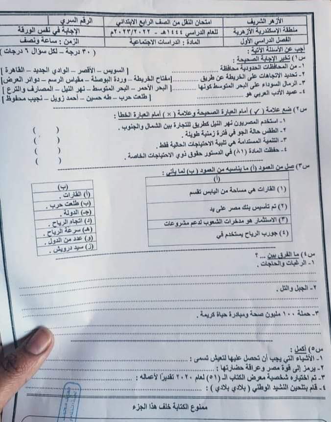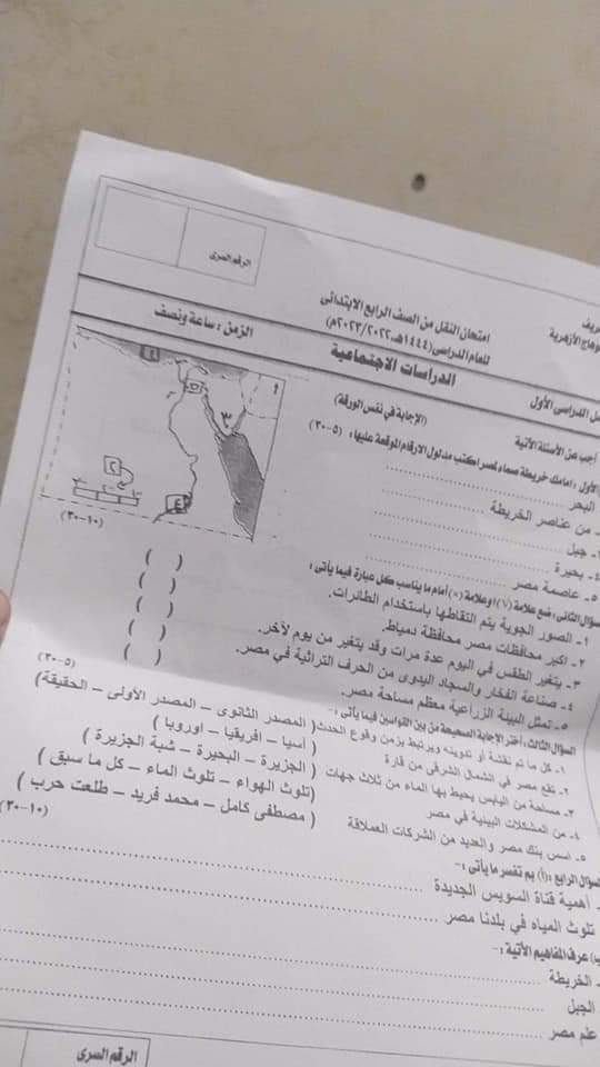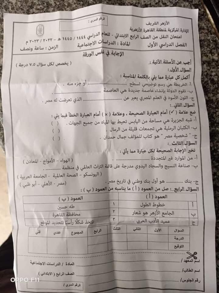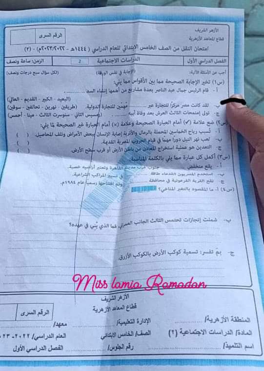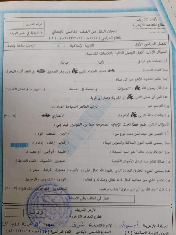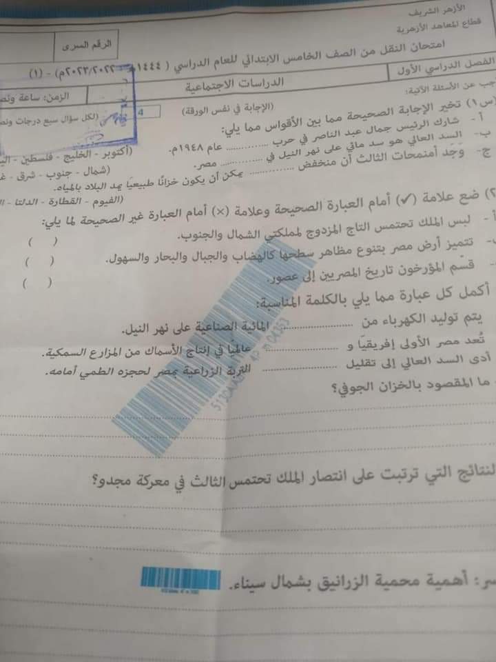 امتحان الدراسات الاجتماعية الصف الخامس الابتدائي أزهر ترم أول 2023