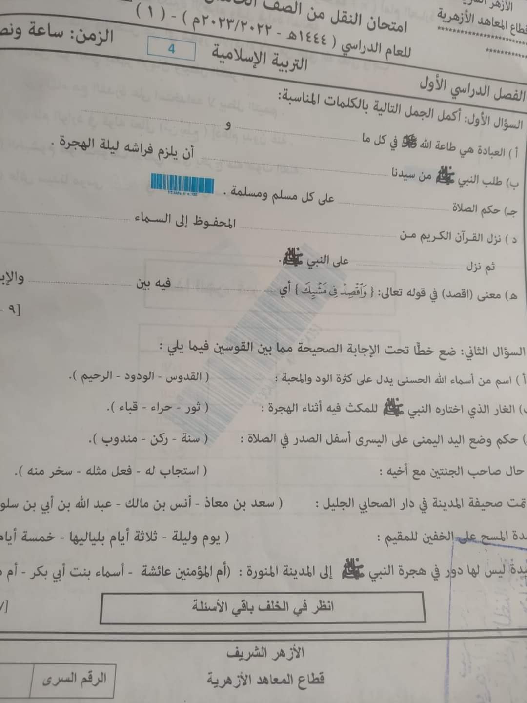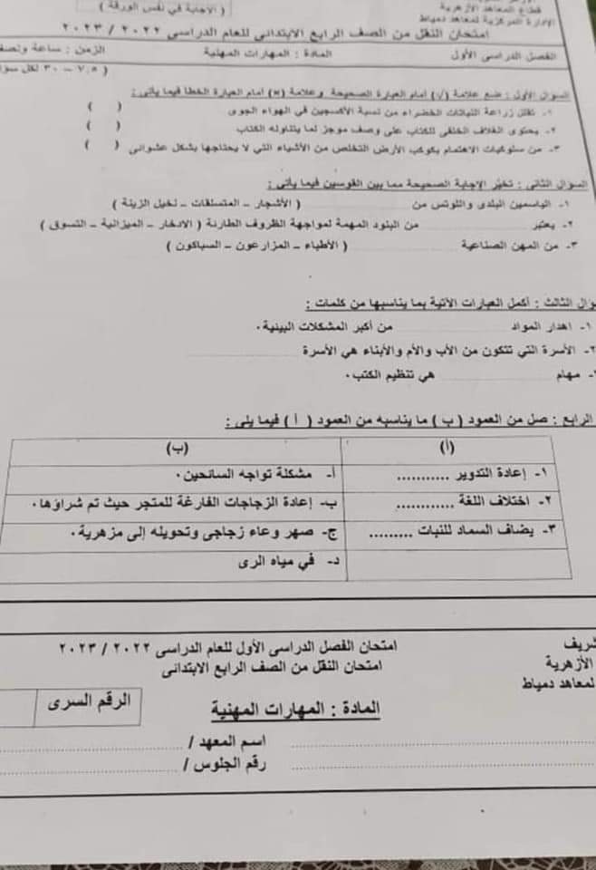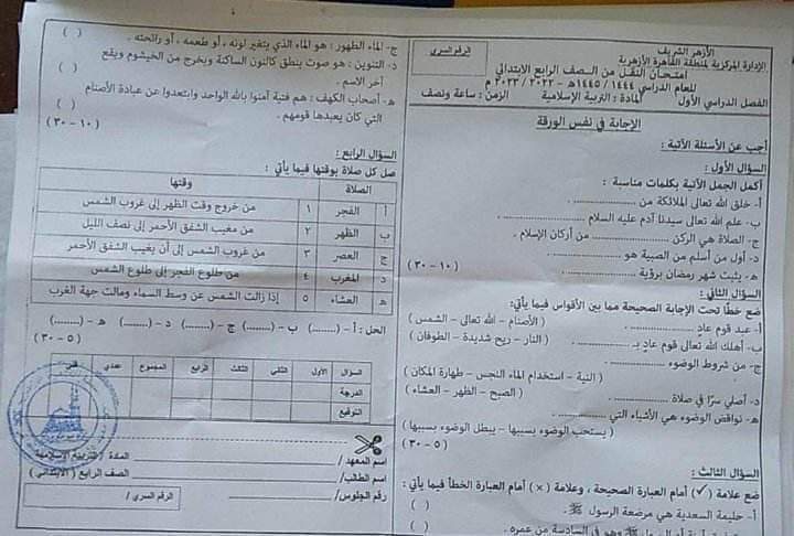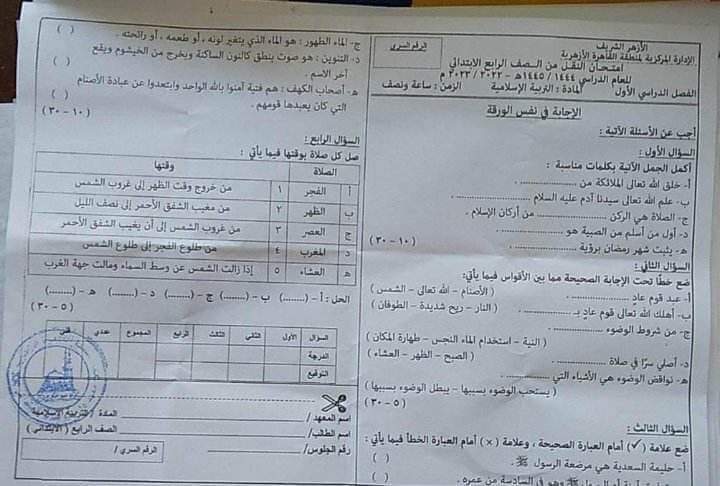 امتحانات الصف الرابع الابتدائي ازهر دراسات اجتماعية وتكنولوجيا المعلومات والتربية الدينية الاسلامية إدارة شرق القاهره ترم أول 2023