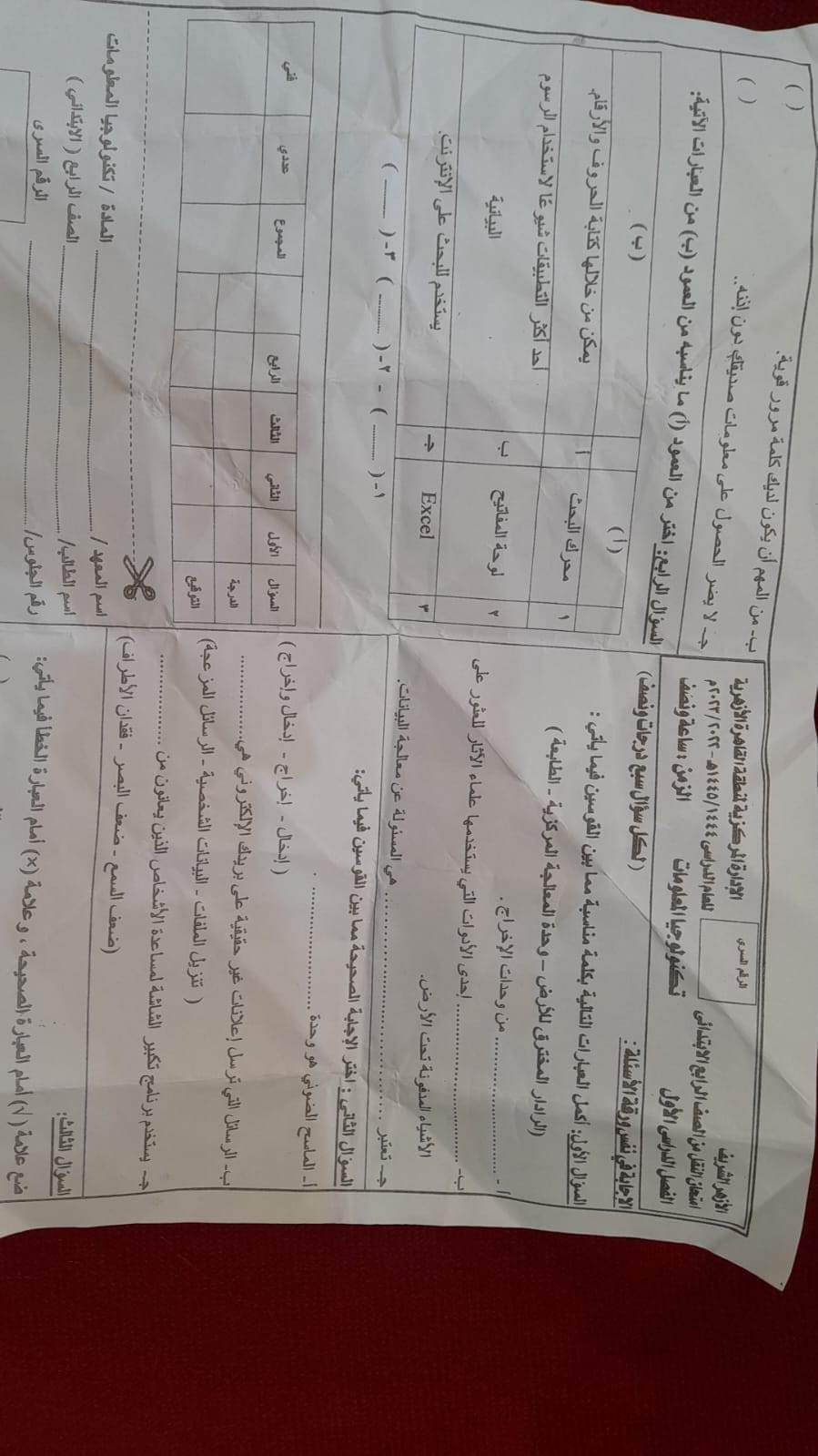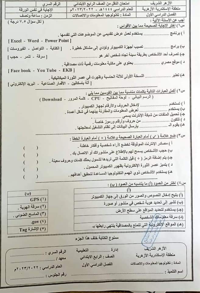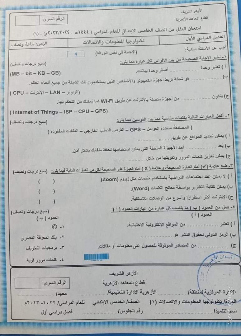 امتحان تكنولوجيا المعلومات للأزهر الصف الخامس الابتدائي الترم الاول 2023