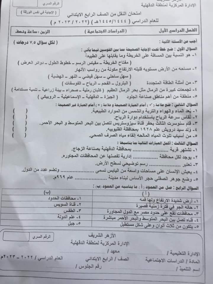 تحميل امتحانات الصف الرابع الابتدائي ازهر دراسات اجتماعية ترم أول 2023