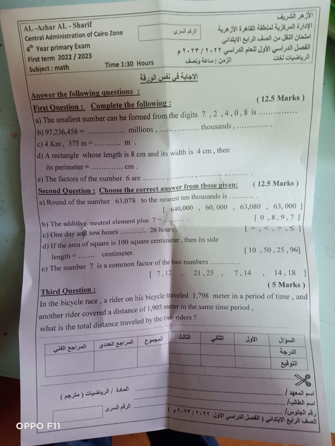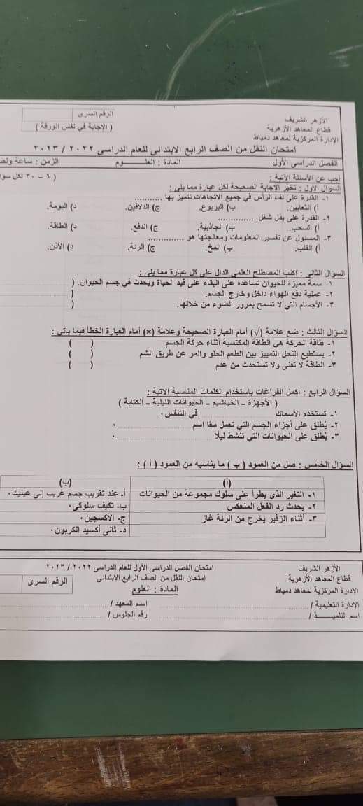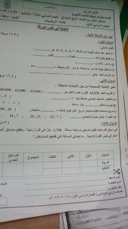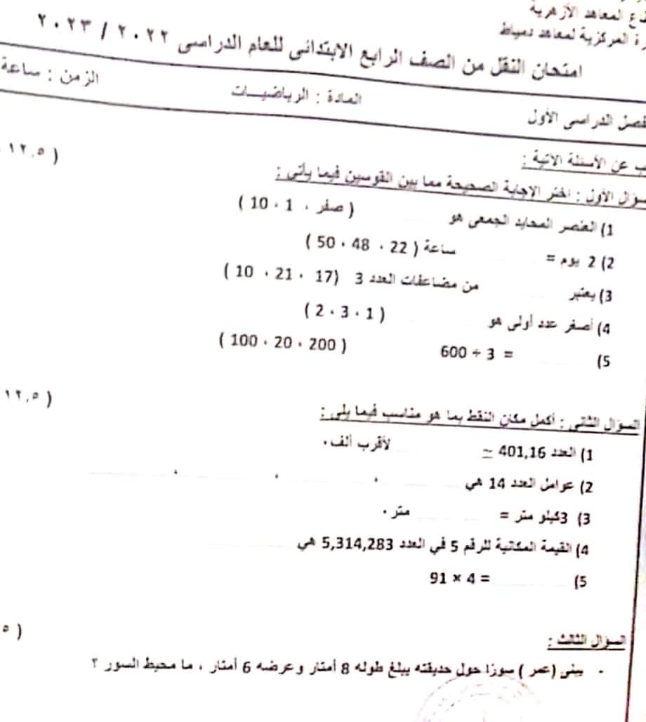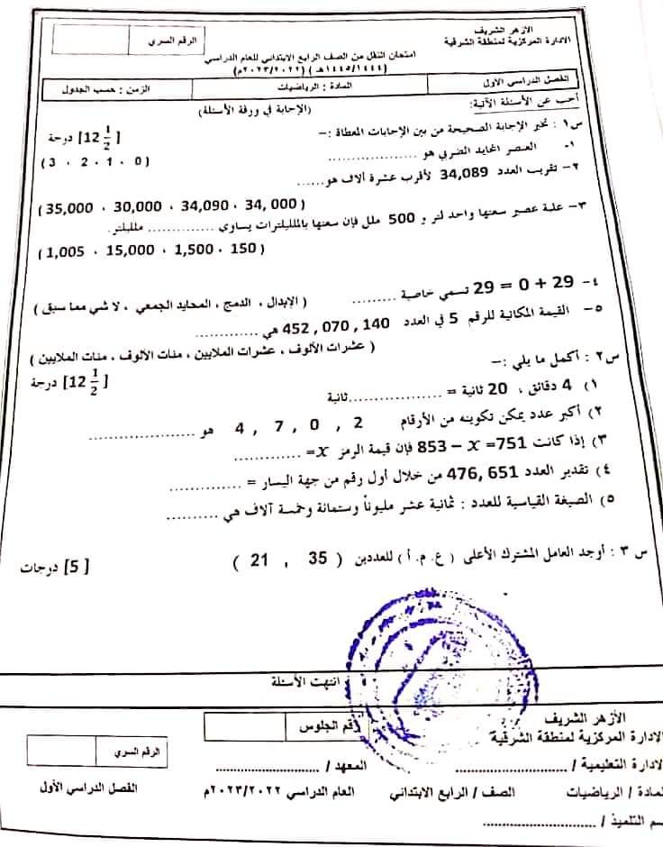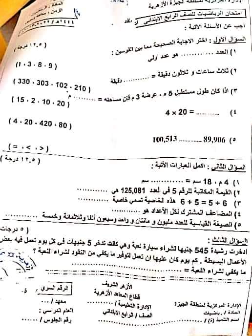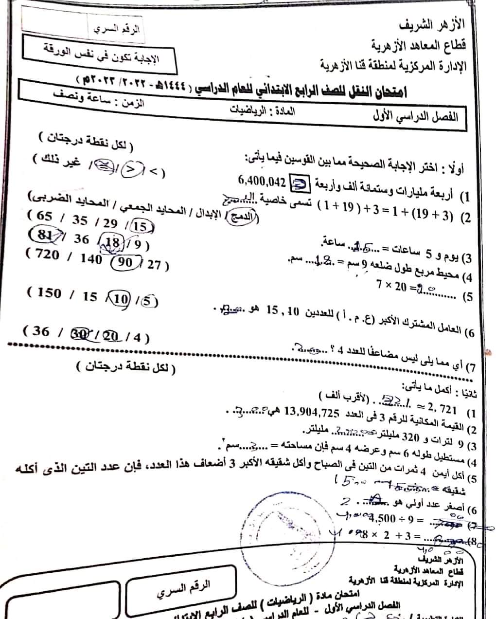 امتحانات رياضيات الصف الرابع الابتدائي الأزهر الشريف محافظات القاهرة والجيزة والشرقية والغربية وقنا ودمياط الترم الاول 2023