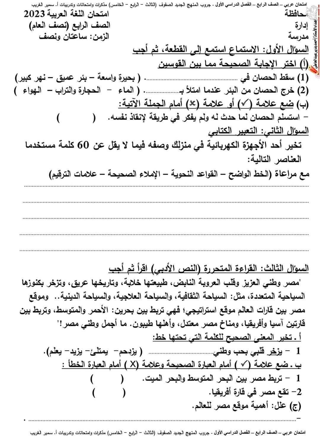 تحميل امتحانات لغة عربية ورياضيات حسب المواصفات الجديدة رابعة ابتدائي 2023