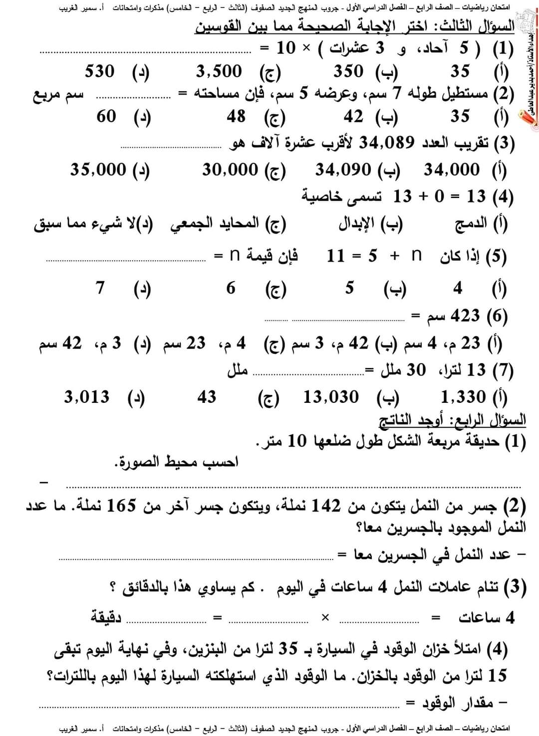 نموذج عربي و رياضيات طبقًا لآخر مواصفات للصف الرابع4️⃣