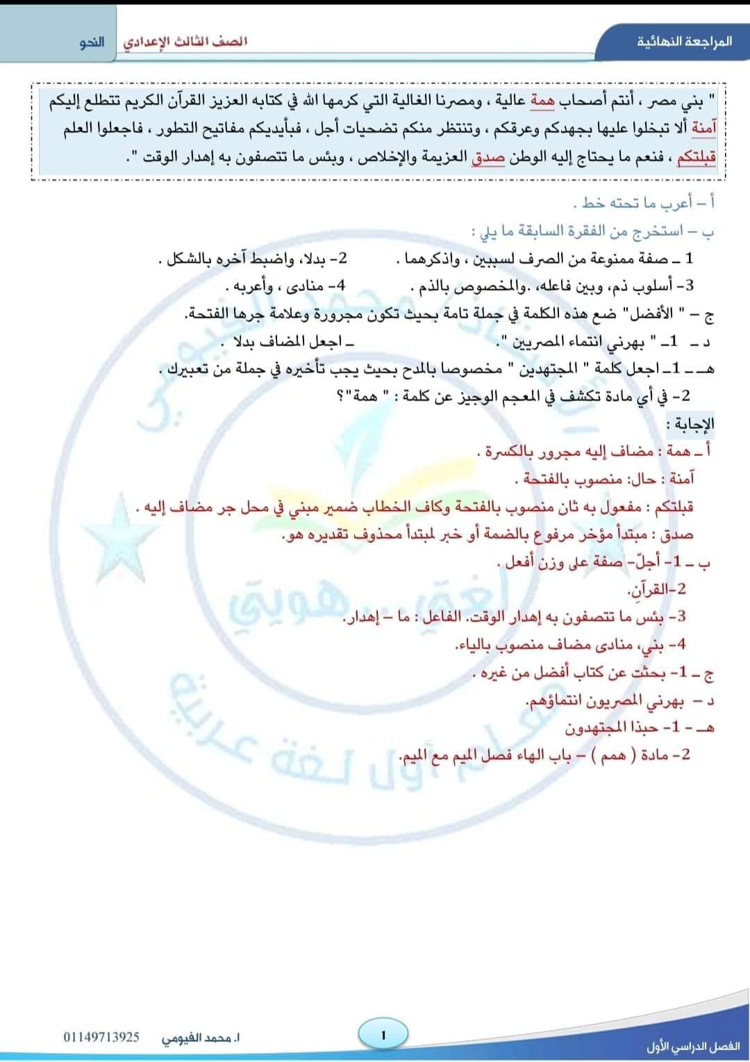 تحميل قطع نحو بالإجابات من امتحانات المحافظات الصف الثالث الاعدادي الترم الاول 2023
