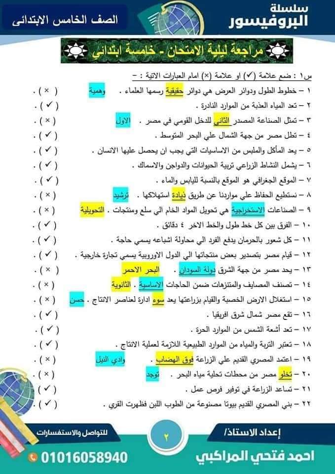 إجابة مراجعة ليلة الامتحان خامسة ابتدائي شاملة المنهج كله 379 سؤال بإذن الله لن يخرج عنهم الامتحان