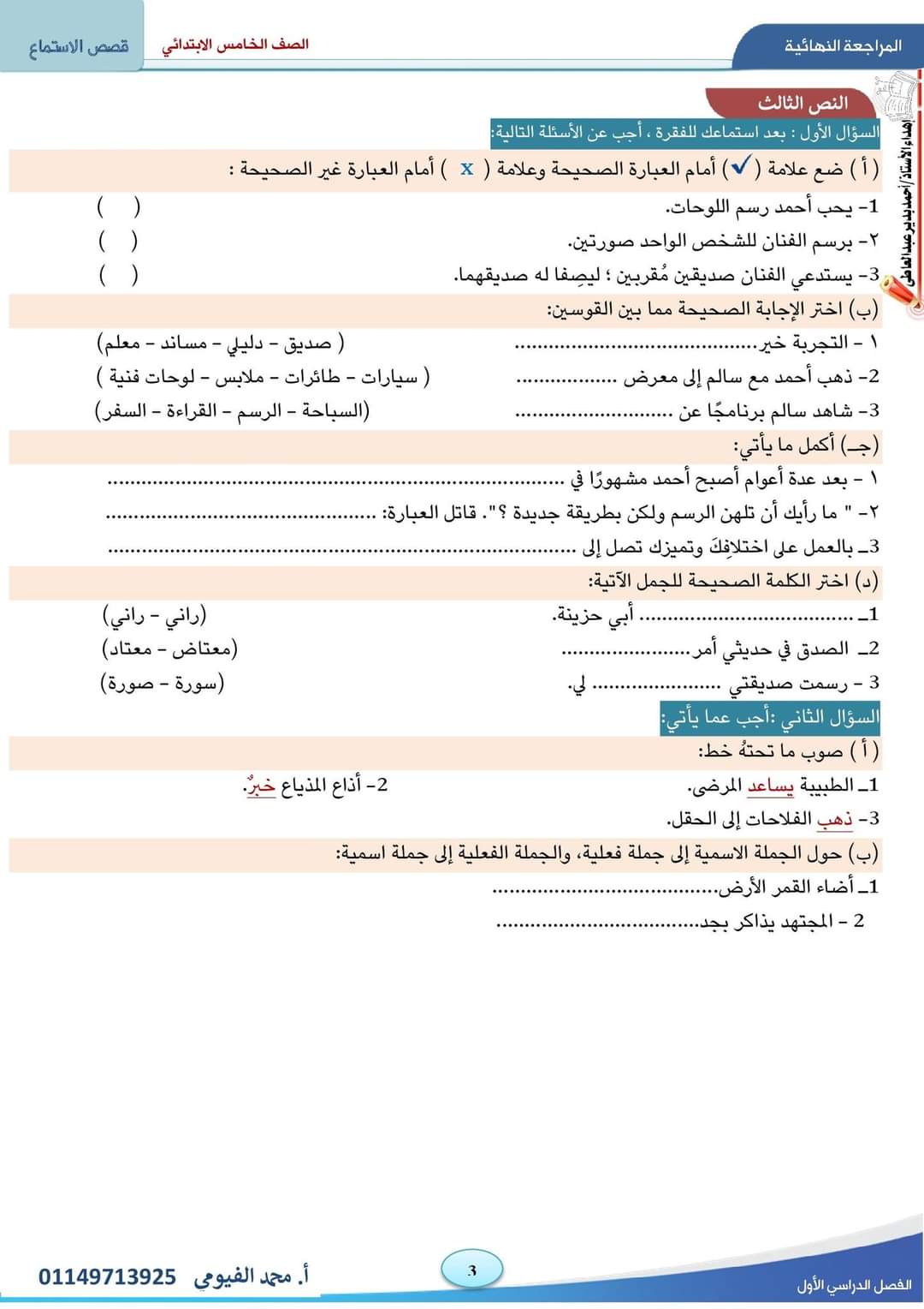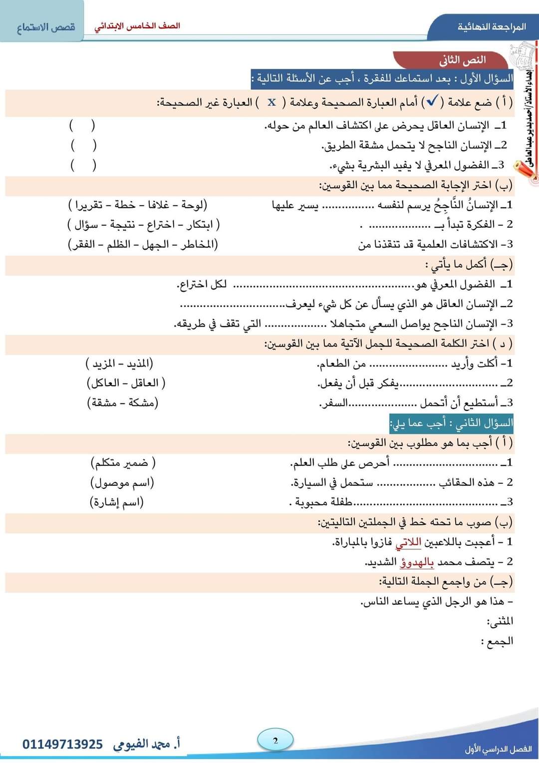 كتاب الأضواء الوحيد الذي ذكر سؤال نصوص للاستماع وهذه تجميعات لها للصف الخامس للأستاذ محمد الفيومي جزاه الله خيرًا