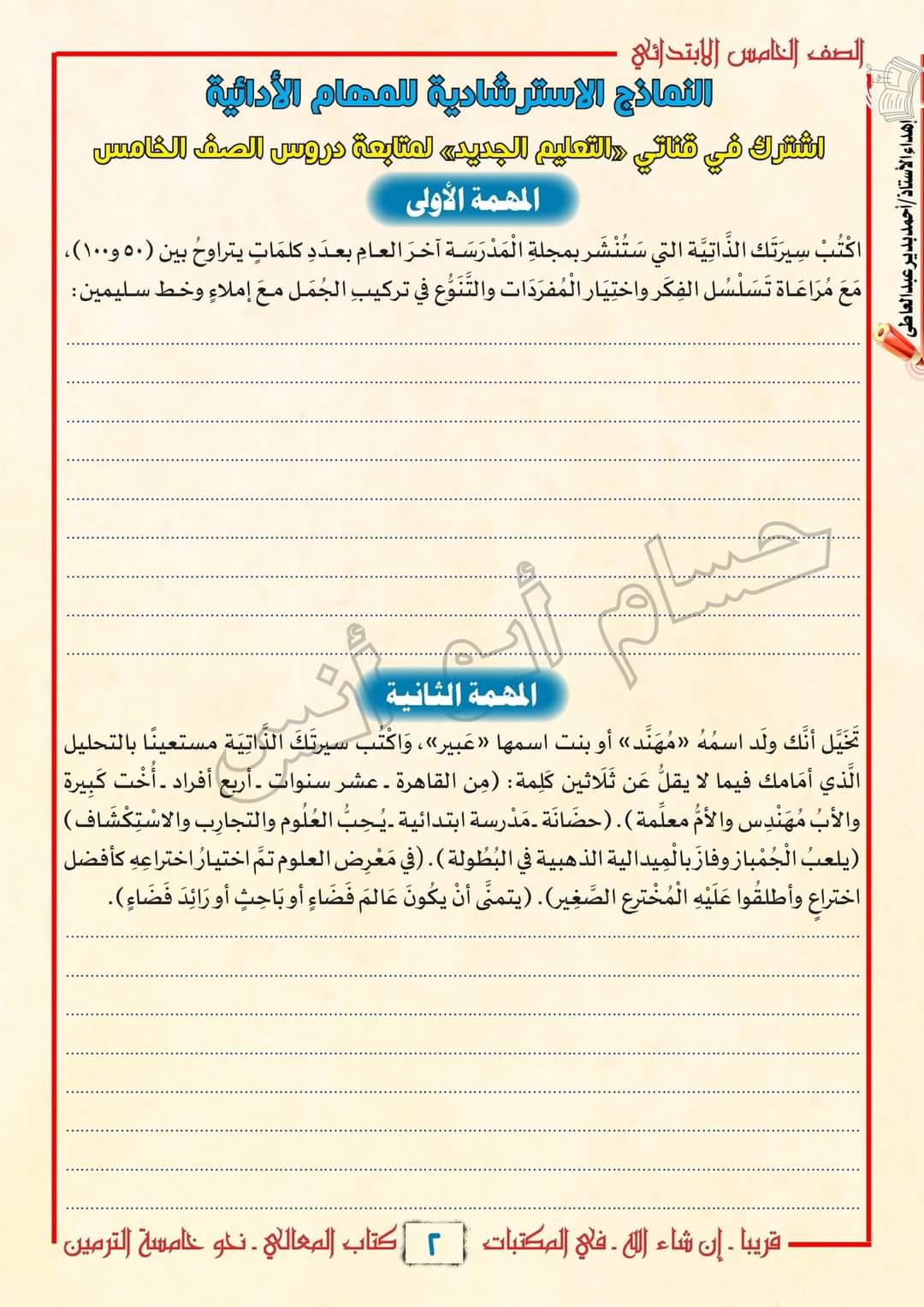 تحميل المهام الادائية في اللغة العربية خامسة ابتدائي الترم الاول 2023 بالاجابات