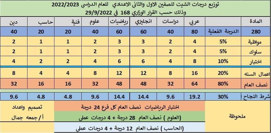 توزيع درجات الشيت للصفين الاول والثاني الاعدادي 2023