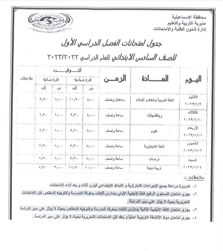 تحميل جداول امتحانات المرحلة الابتدائية محافظة الاسماعيلية الترم الاول 2023