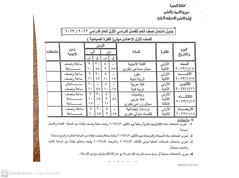 جدول امتحانات المرحلة الاعدادية محافظة البحيرة الترم الاول 2023