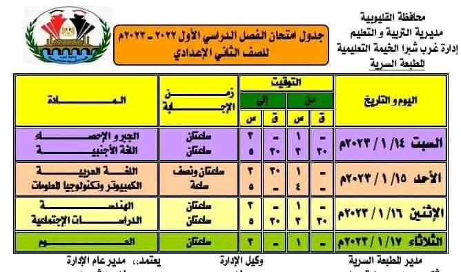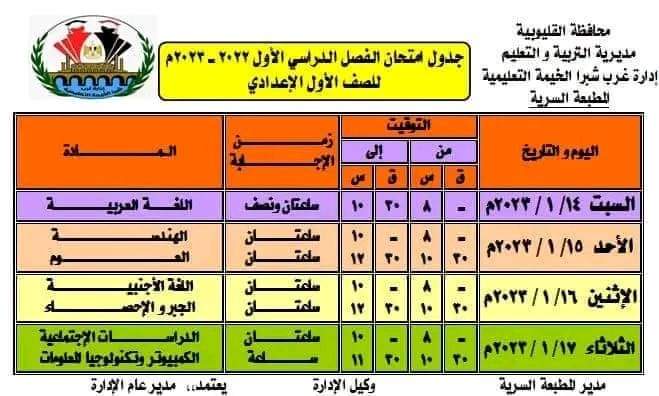 جدول امتحانات الصف الاول والثاني الاعدادي محافظة القليوبية ترم اول 2023