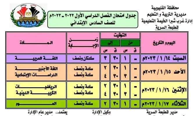 جدول امتحانات الصف الرابع والخامس والسادس الابتدائي محافظة القليوبية ترم اول 2023