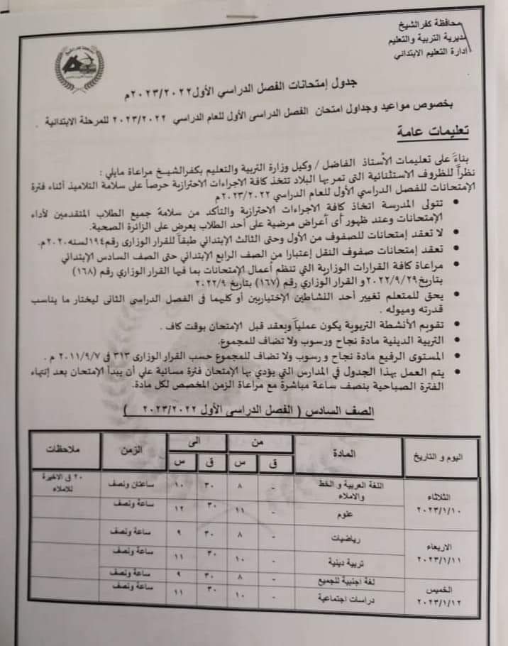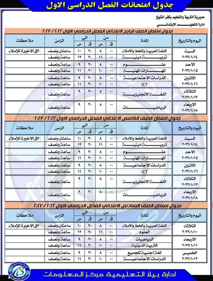 تحميل جدول امتحانات الترم الاول 2023 الصف الرابع والخامس الابتدائي محافظة كفر الشيخ