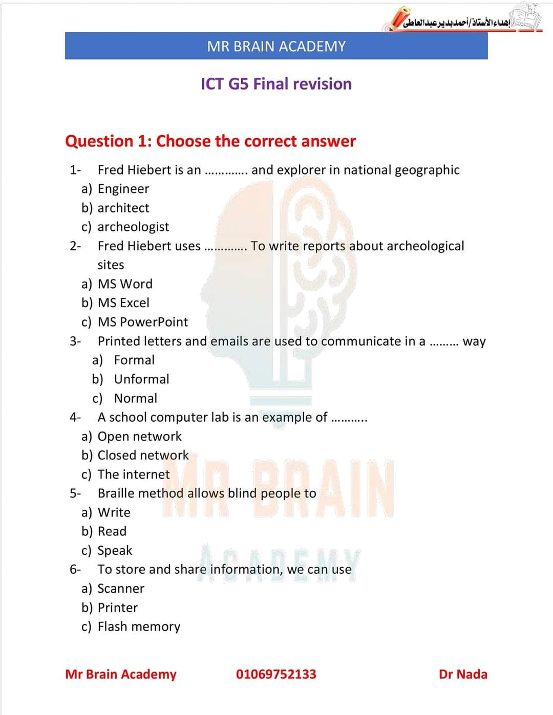 المراجعة النهائية ICT للصف الخامس مع الإجابة ، للطباعة هنا 👇