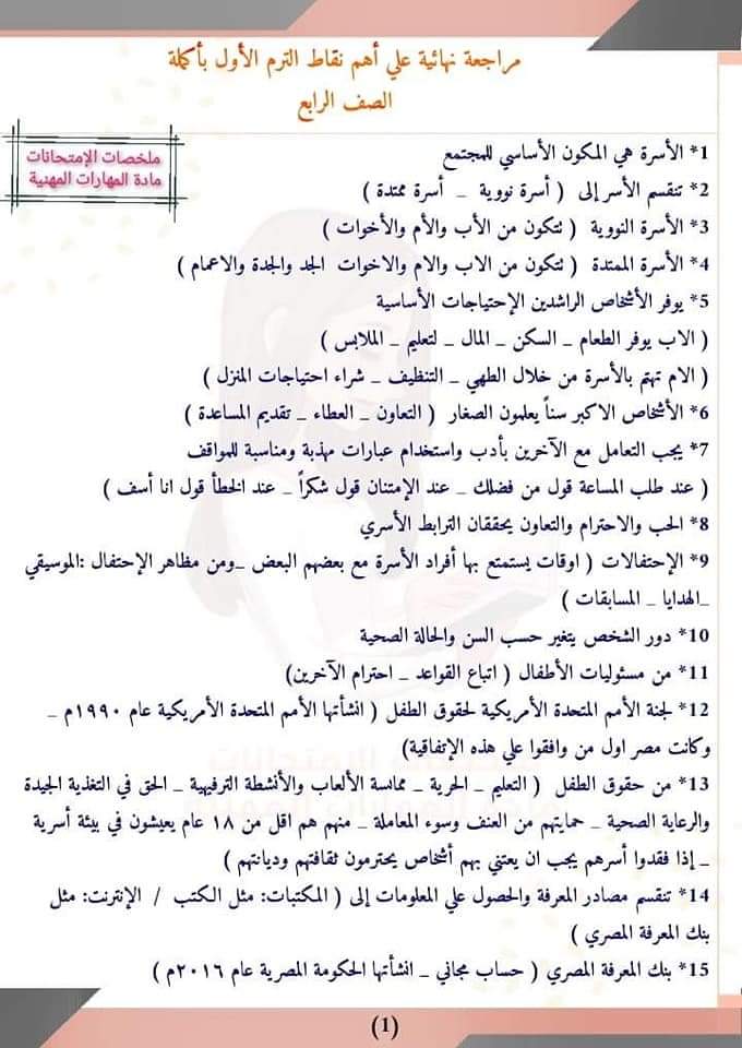 تحميل مذكرة مراجعة ليلة الامتحان مهارات مهنية الصف الرابع الابتدائي الترم الاول 2023 بالاجابات