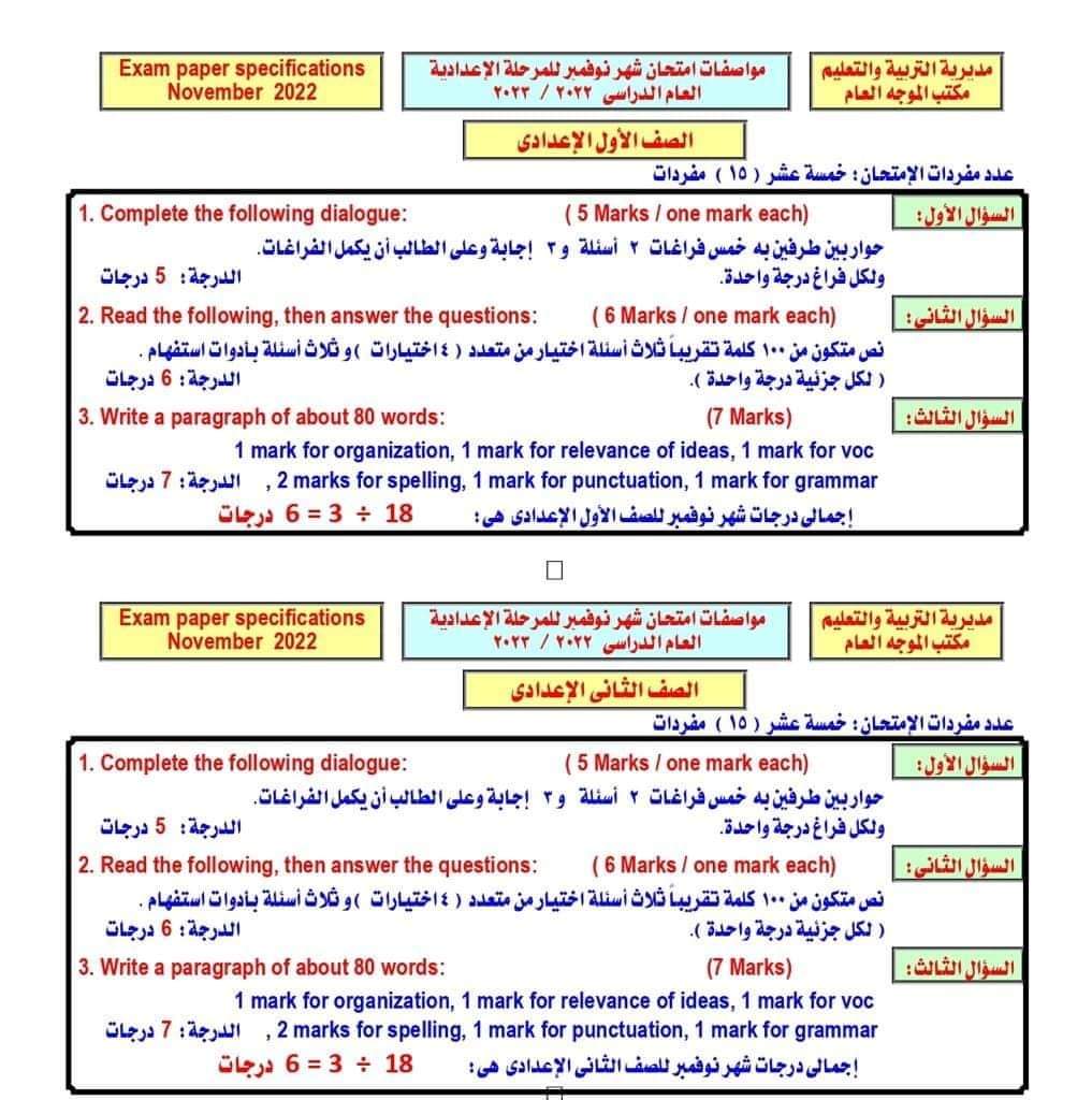 مواصفات امتحان اللغة الانجليزية للصف الأول والثاني الاعدادي 2023