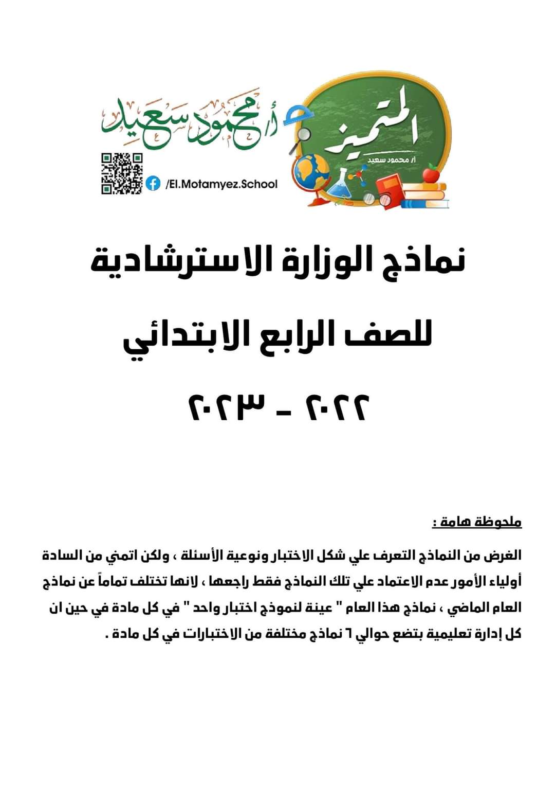 النماذج عبارة ( اختبار واحد او اختبارين ) في كل مادة ، طبعاً مهم جداً اننا نتدرب عليهم كويس بس أرجوكــــــــــــــــــــــــم محدش يفكر ان دي نماذج مطابقة للعام الماضي يعني هنذاكر في كل مادة صفحة او صفحتين و 100 % هييجي منهم الامتحان ، لا دي نماذج بمعني ” خد فكــرة ” عن شكل الامتحان … كل ادارة تعليمية بتحط أكثر من اختبار مختلف ممكن توصل ل 6 او 7 اختبارات مختلفة في كل مادة ….. نتدرب ونفهم شكل الاختبارات فقط من خلال النماذج دي ونركز علي المزاكرة فيما تبقي من وقت وربنا يعينكم ويعين أولادنا …. بالتوفيق – المتميز – أ / محمود سعيد