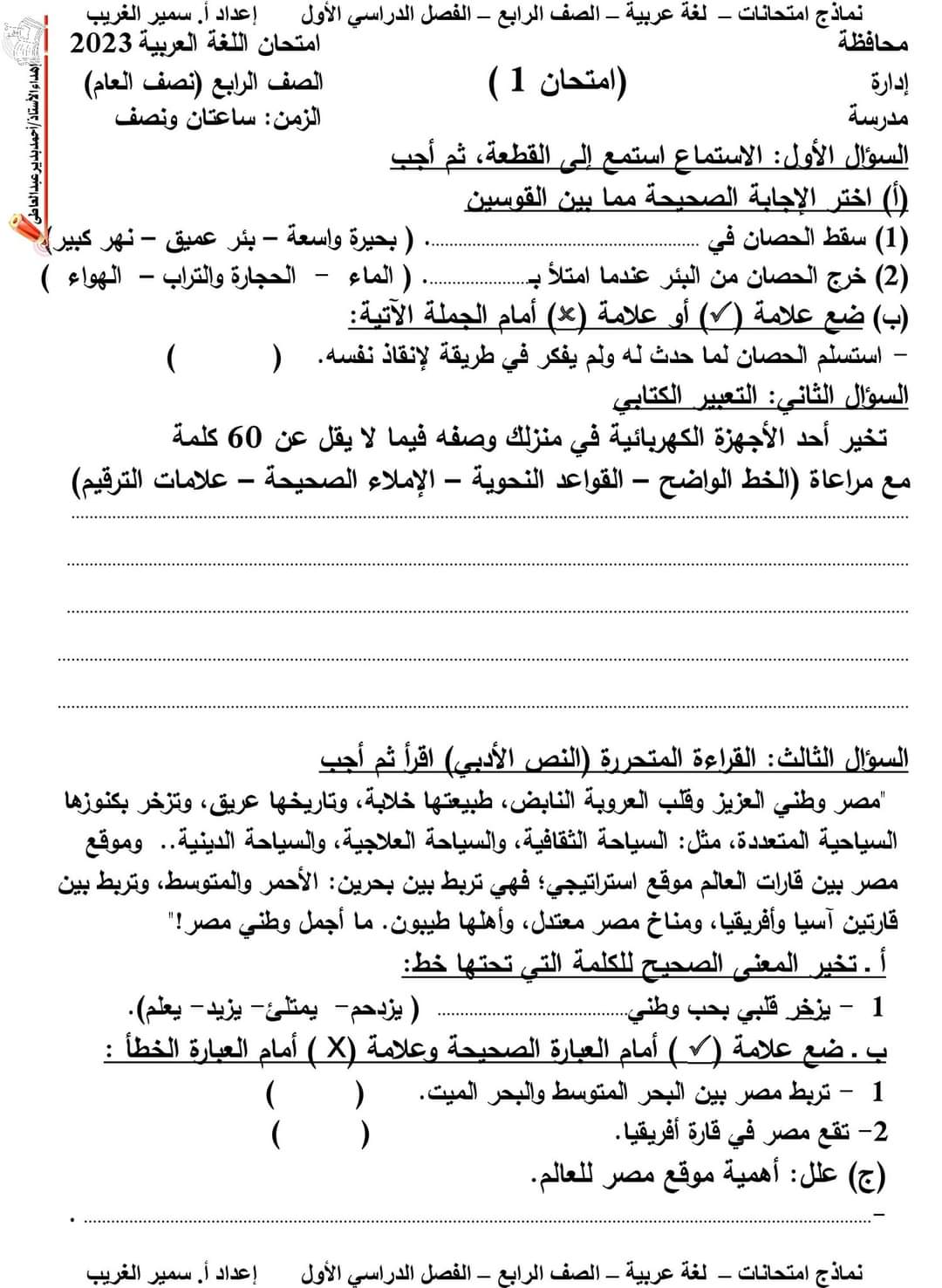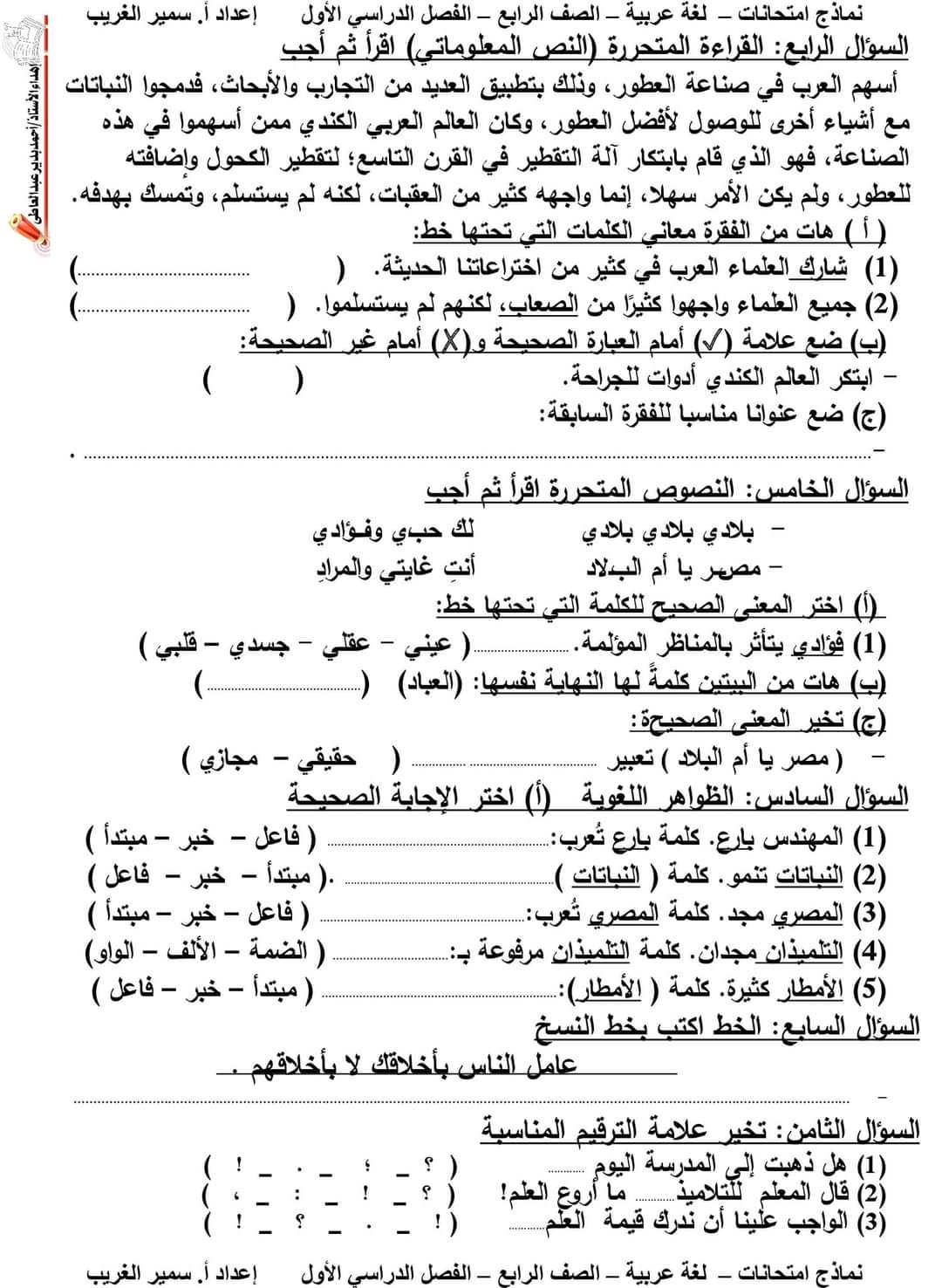 تحميل نماذج امتحانات تدريبية لغة عربية للصف الرابع مطابقة للمواصفات إعداد الأستاذ/ سمير الغريب