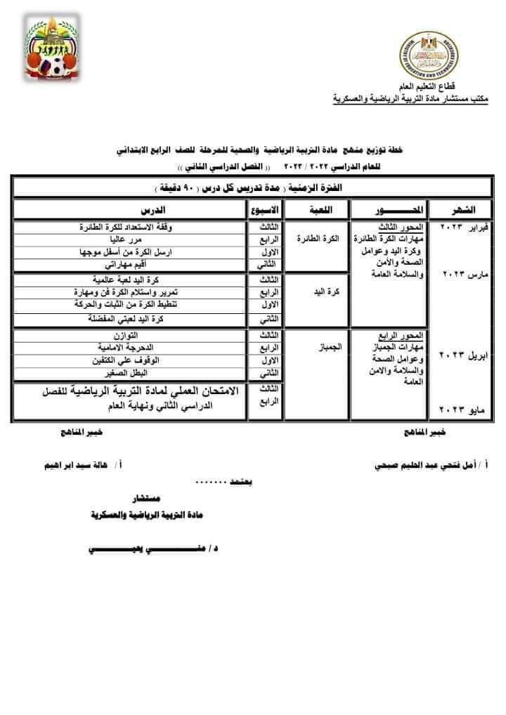 تحميل توزيع منهج التربية الرياضية الصف الرابع الابتدائي الترم الثاني 2023