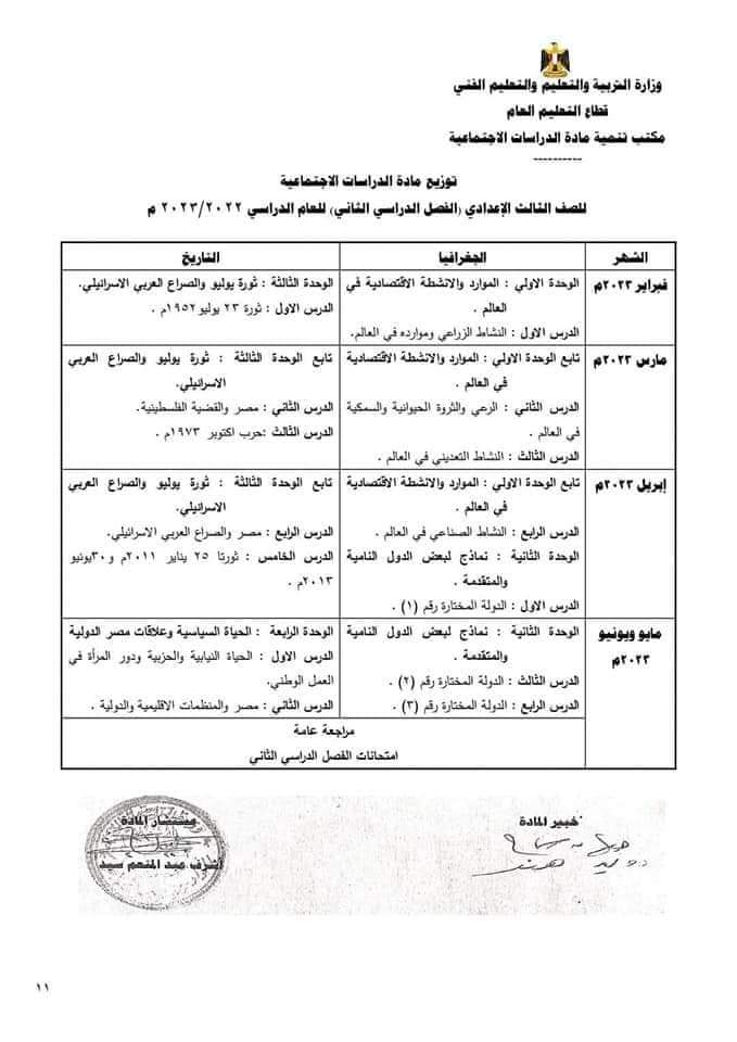 توزيع منهج الدراسات الاجتماعية الصف الثالث الاعدادي الترم الثاني 2023