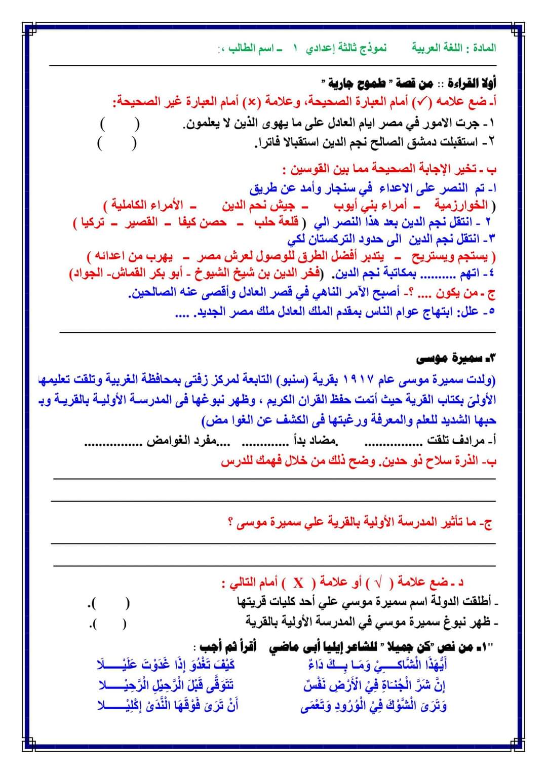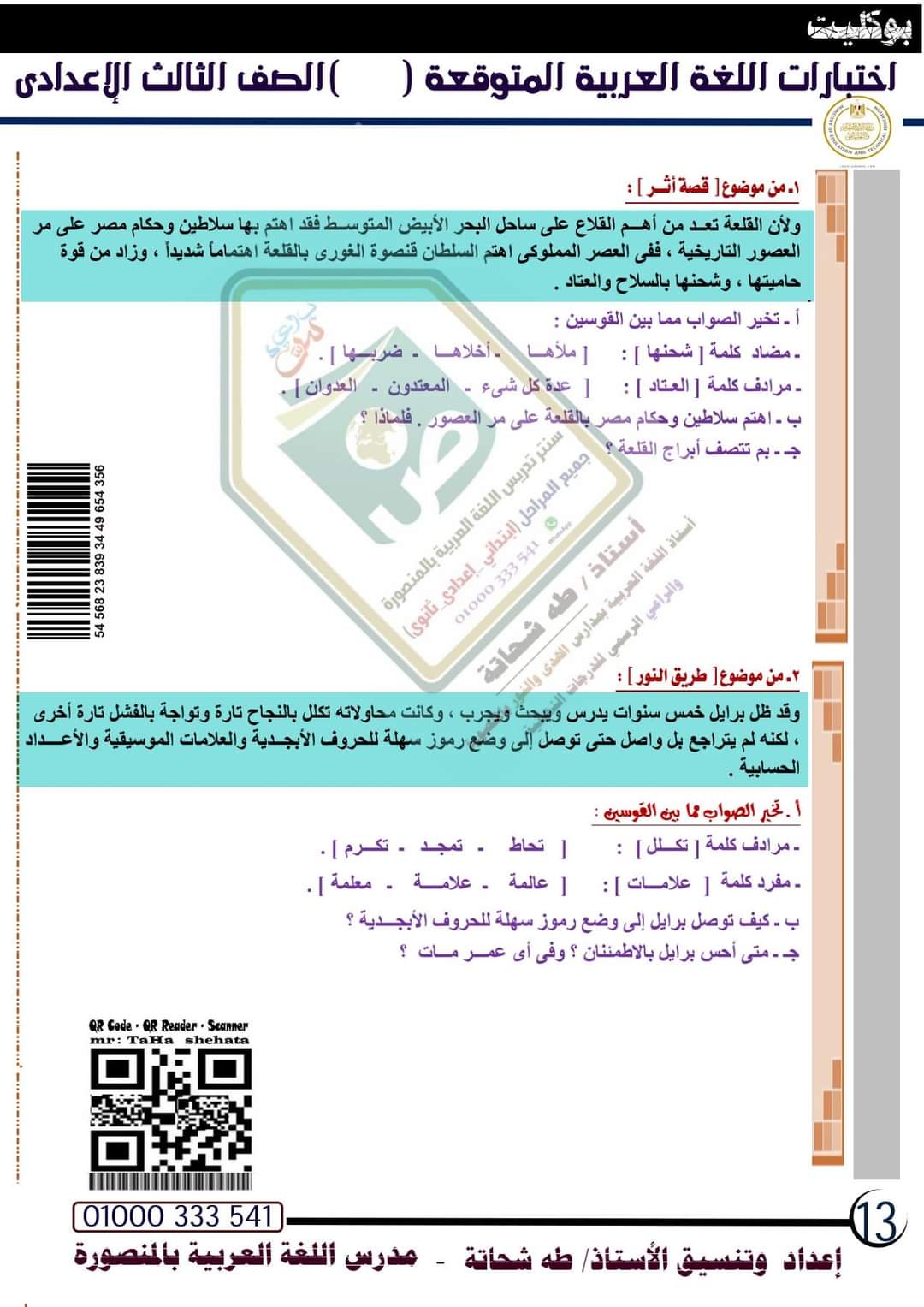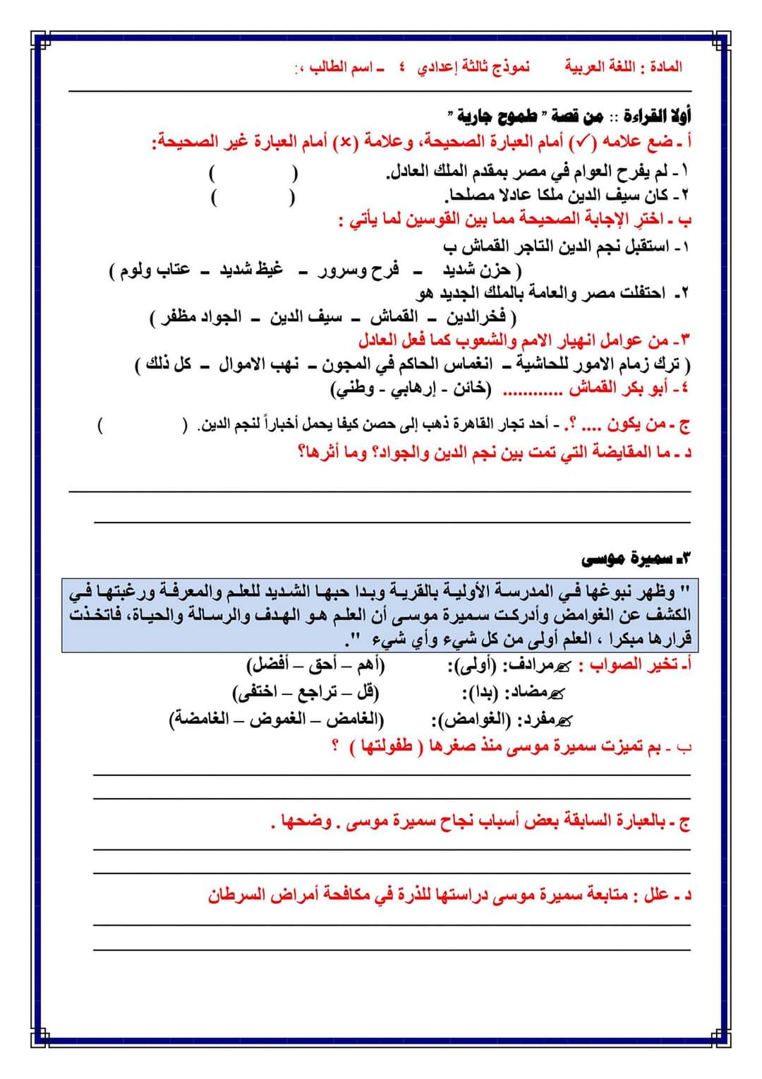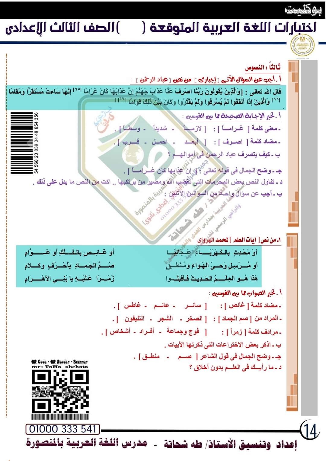 تحميل امتحانات لغة عربية متوقعة الصف الثالث الاعدادي الترم الاول 2023