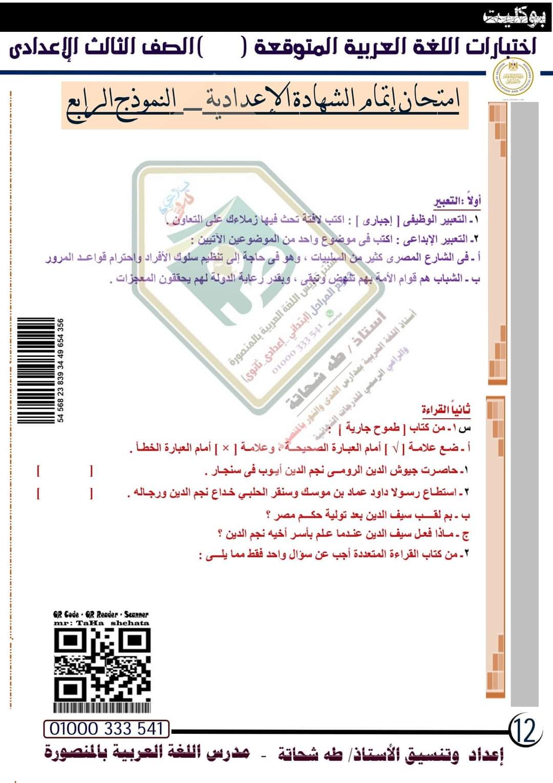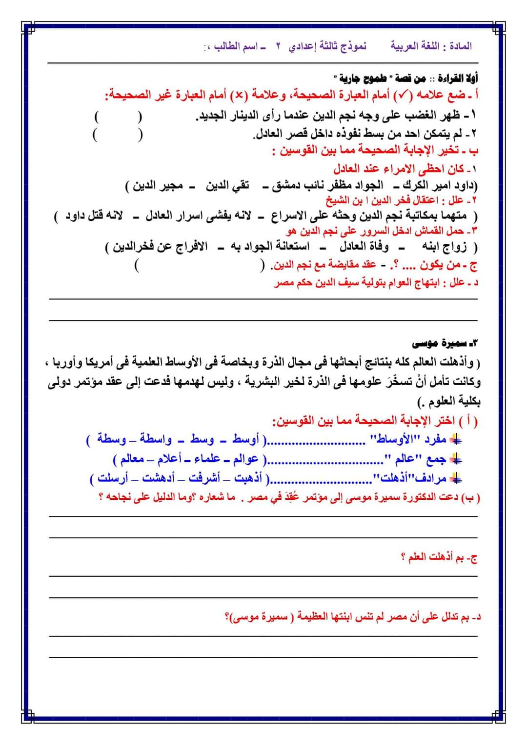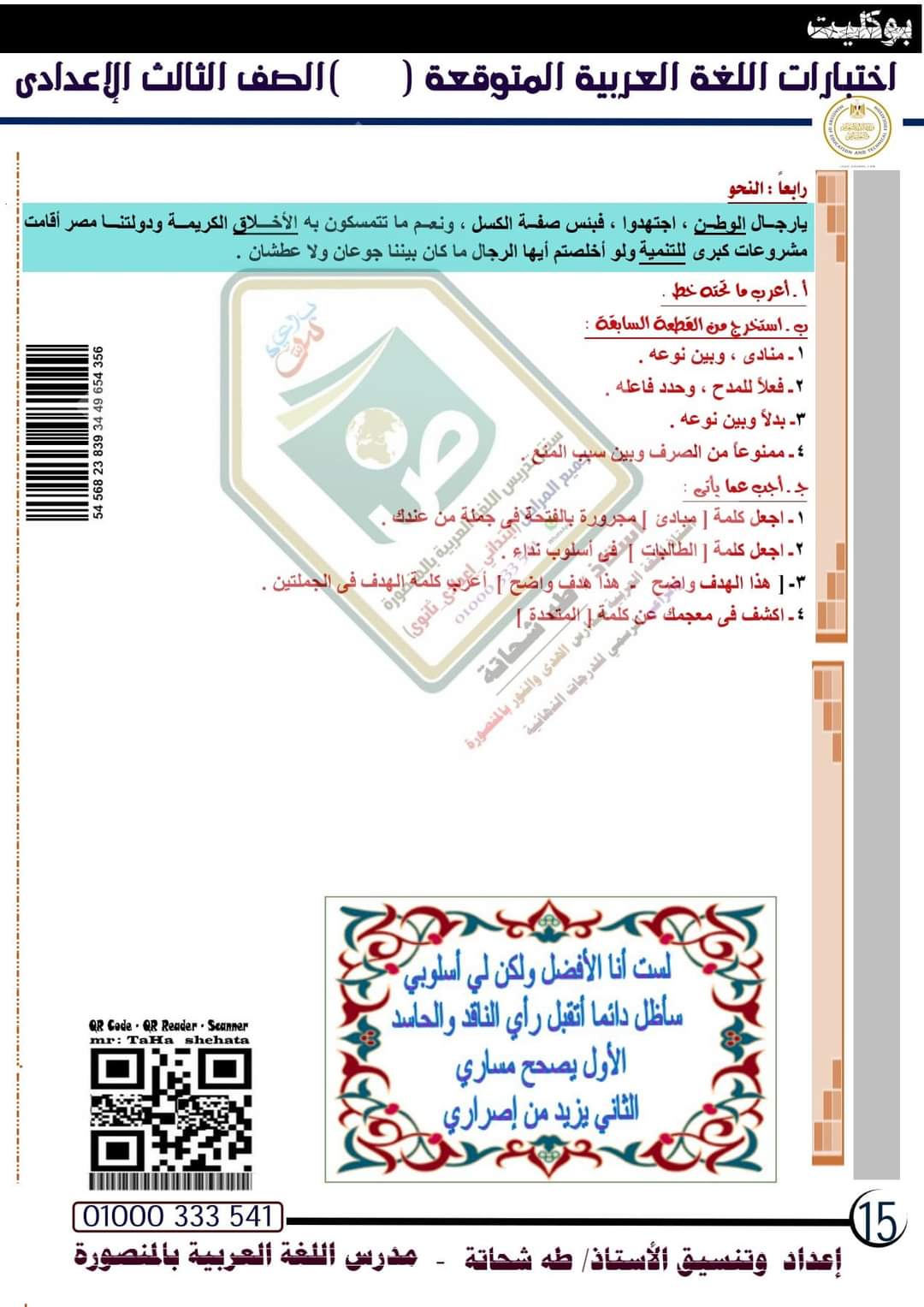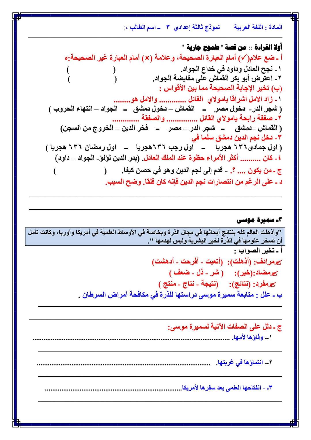 تحميل امتحانات لغة عربية متوقعة الصف الثالث الاعدادي الترم الاول 2023