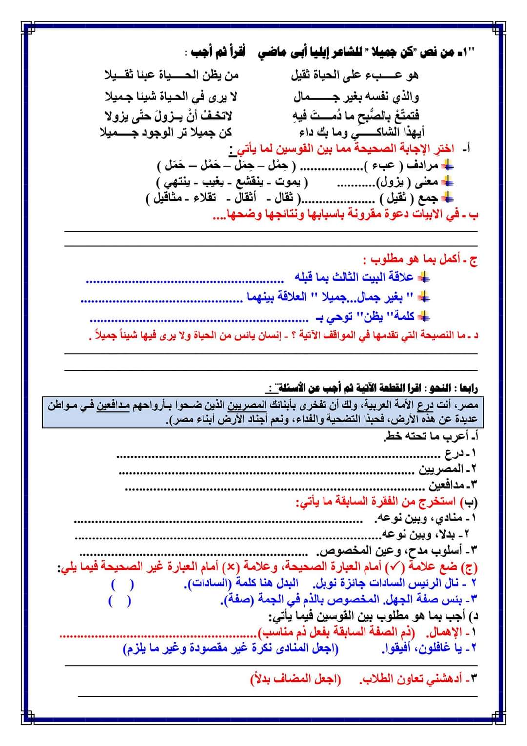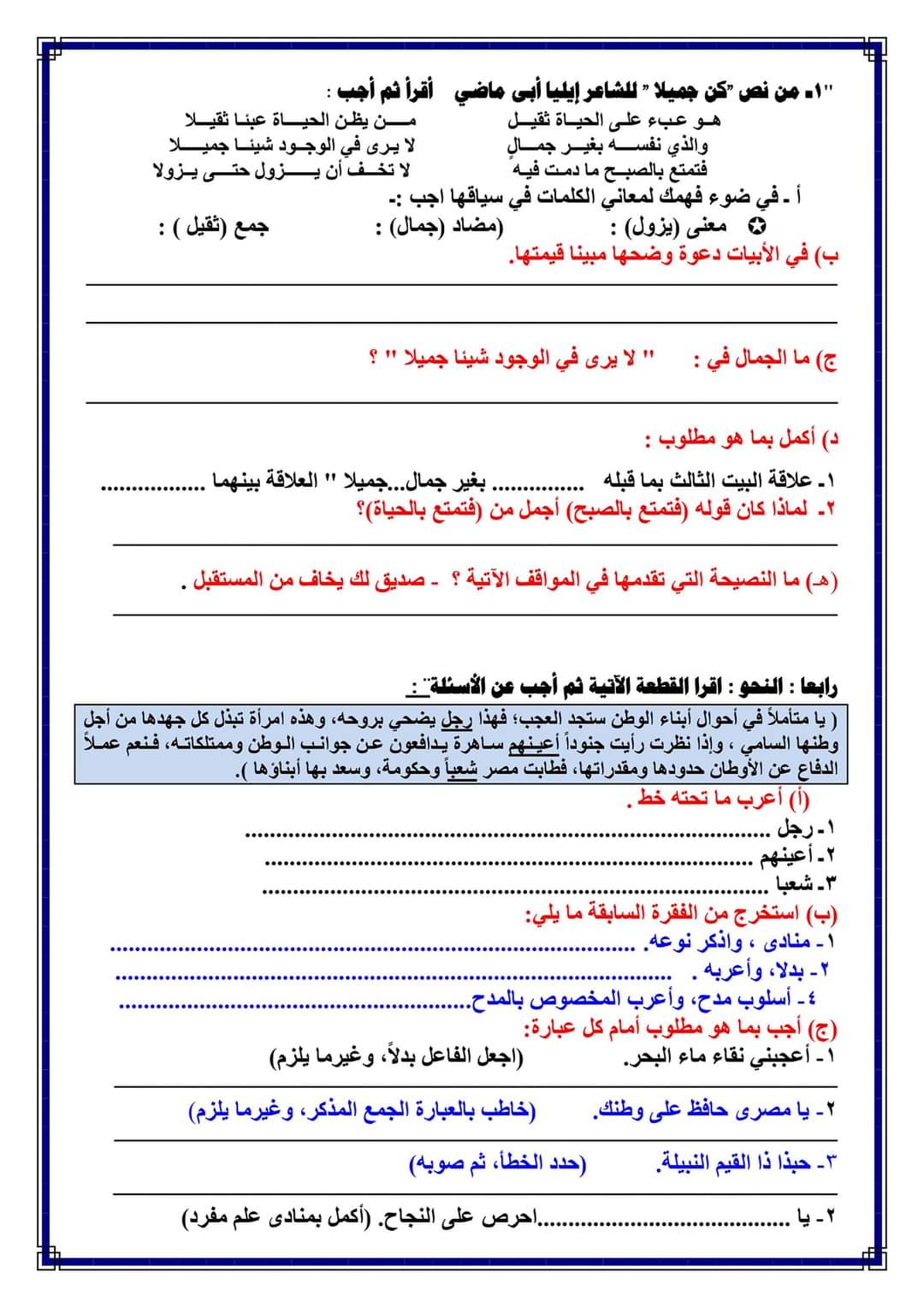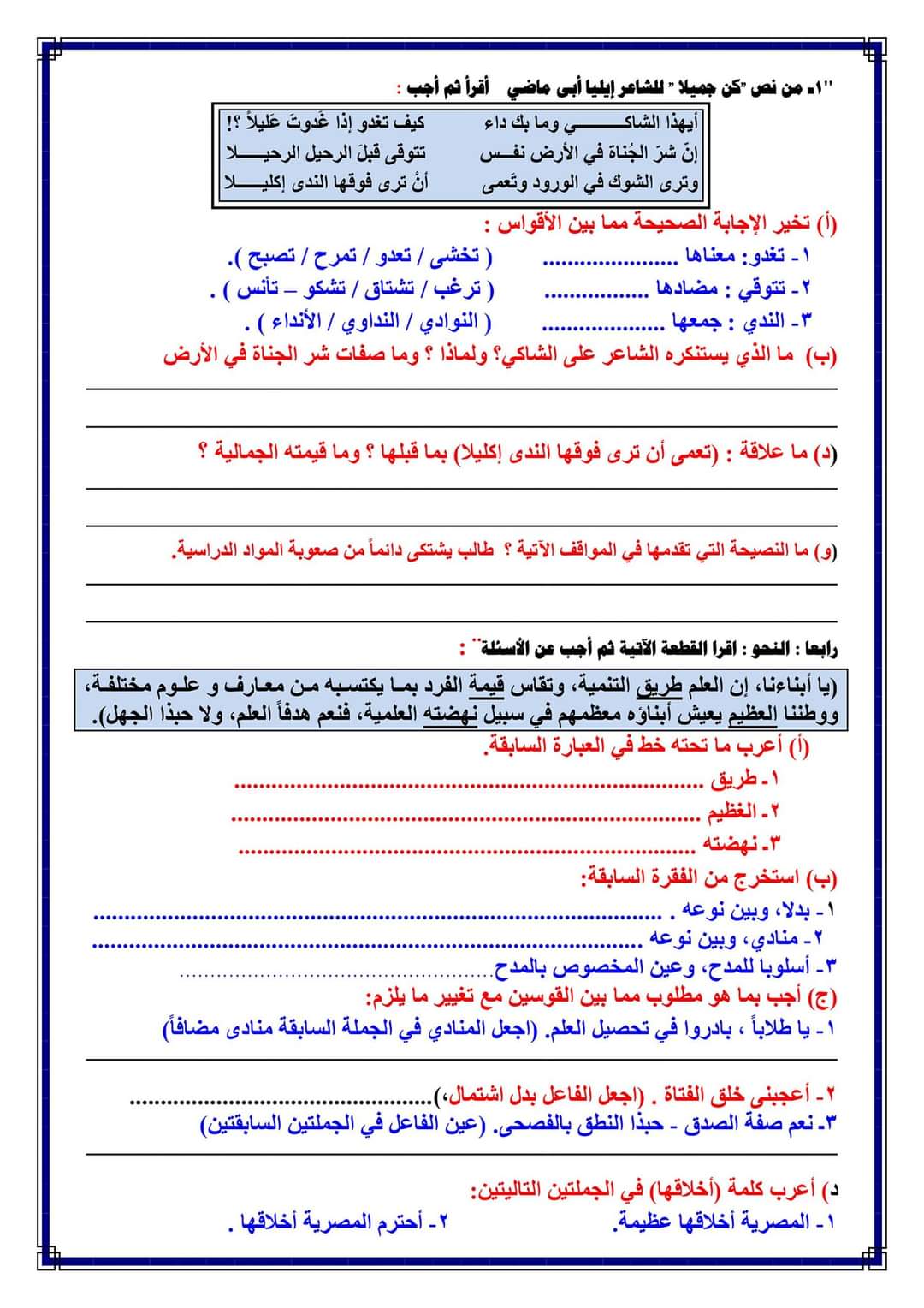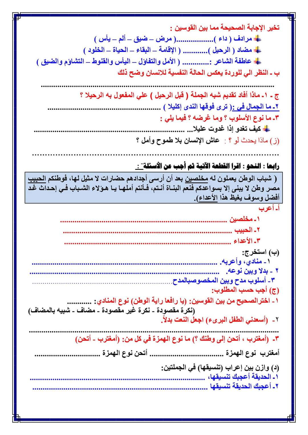 تحميل امتحانات لغة عربية متوقعة الصف الثالث الاعدادي الترم الاول 2023