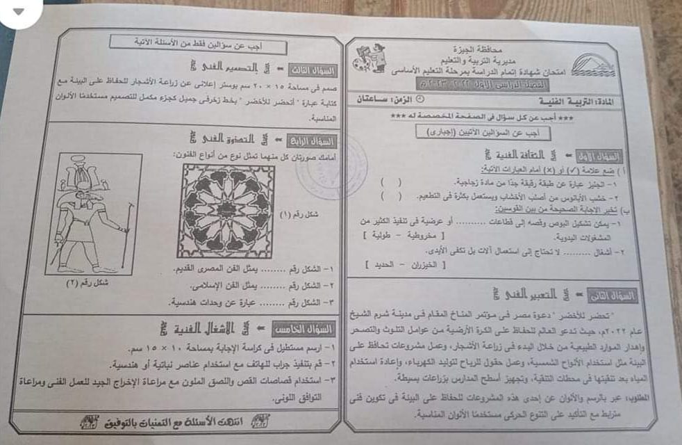 تحميل امتحان التربية الفنية محافظة الجيزة الصف الثالث الاعدادي الترم الاول 2023