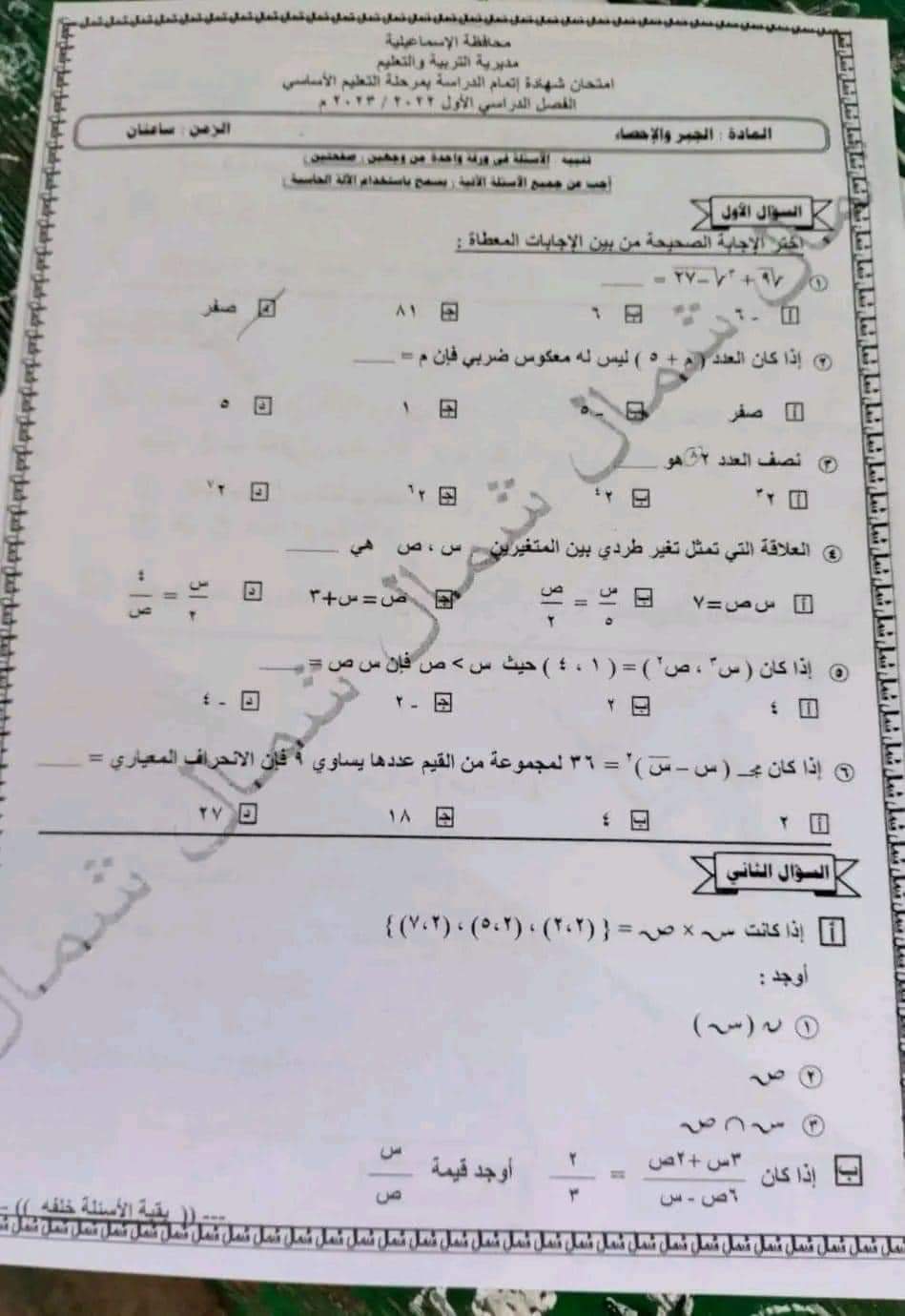 تحميل امتحان الجبر والاحصاء محافظة الاسماعيلية الصف الثالث الاعدادي الترم الاول 2023