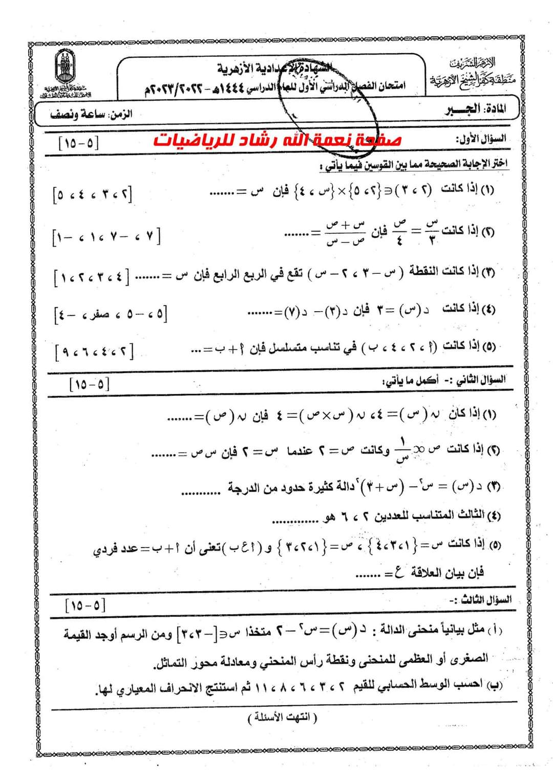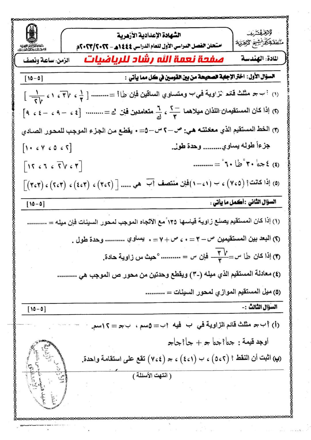 تحميل امتحان الجبر والهندسة الشهادة الاعدادية الأزهرية الترم الاول 2023