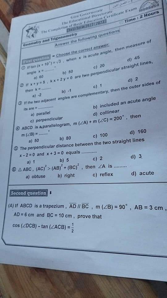 تحميل امتحان الجيومتري محافظة الجيزة الصف الثالث الاعدادي الترم الاول 2023