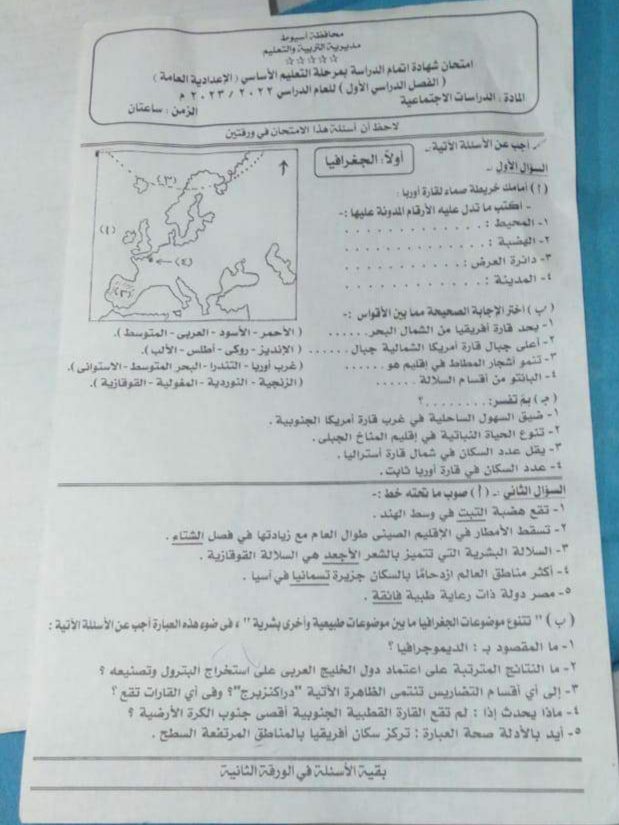 تحميل امتحان الدراسات الاجتماعية محافظة اسيوط الصف الثالث الاعدادي الترم الاول 2023