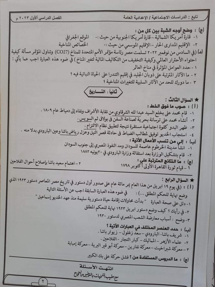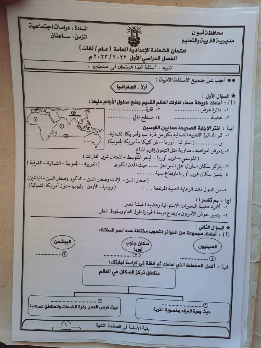 تحميل امتحان الدراسات محافظة اسوان الصف الثالث الاعدادي الترم الاول 2023
