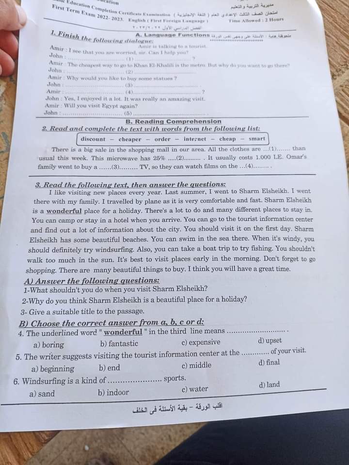 امتحان اللغة الانجليزية محافظة البحيرة تالتة اعدادي الترم الاول 2023