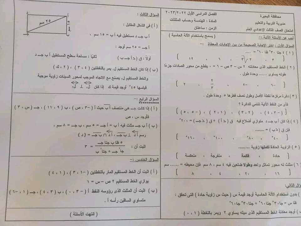 تحميل امتحان الهندسة محافظة البحيرة الصف الثالث الاعدادي الترم الاول 2023