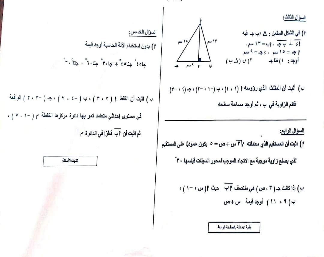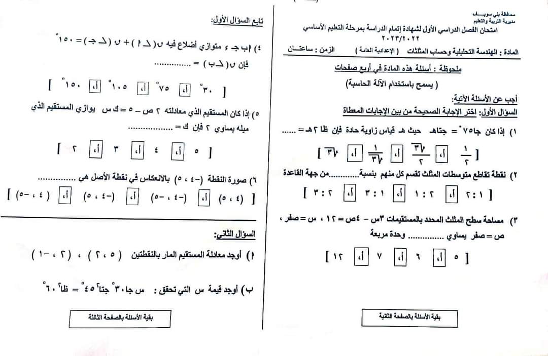 تحميل امتحان الهندسة وحساب المثلثات محافظة بني سويف الصف الثالث الاعدادي الترم الاول 2023