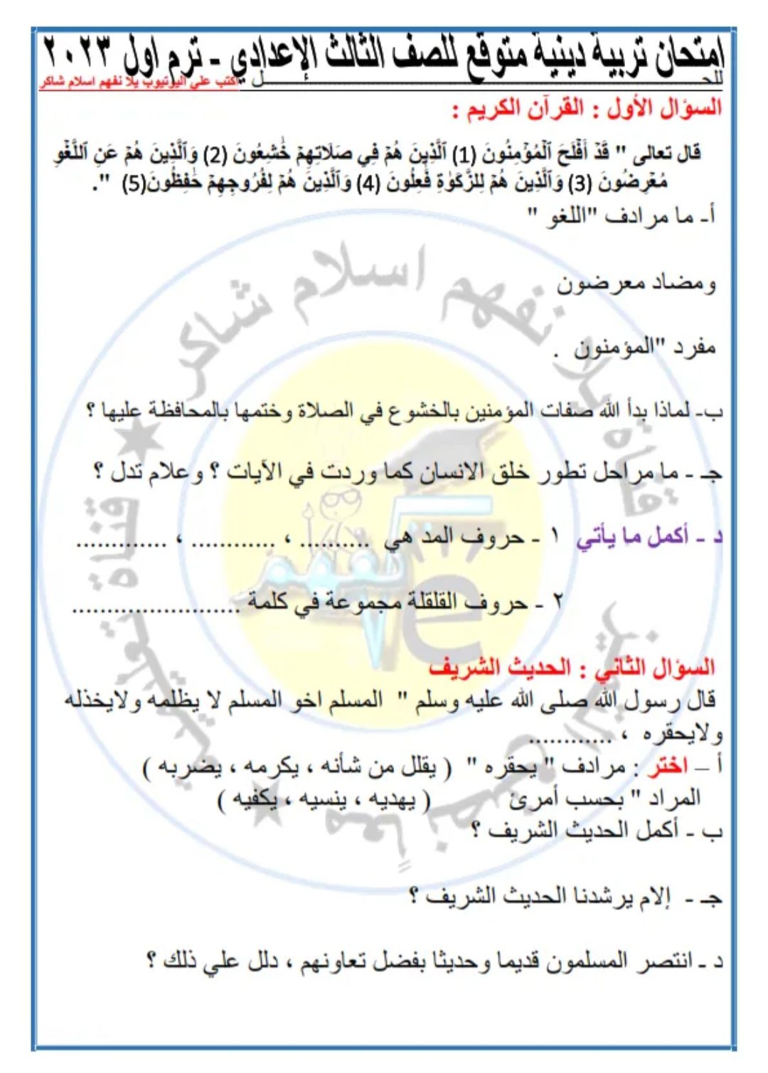 تحميل امتحان تربية اسلامية متوقع الصف الثالث الاعدادي الترم الاول 2023