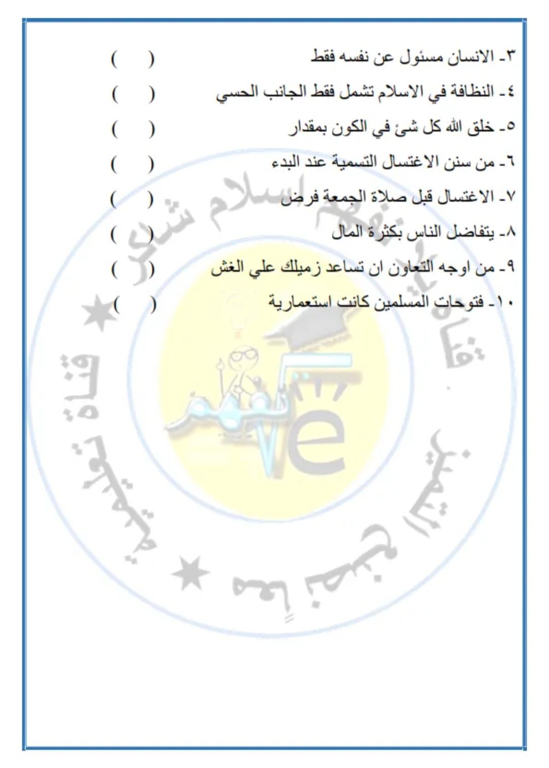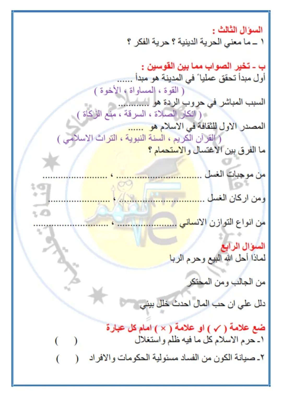 مراجعة وتوقعات امتحان التربية الدينية للصف الثالث الاعدادى الفصل الدراسى الاول, امتحان متوقع تربية اسلامية للصف الثالث الإعدادي ترم أول