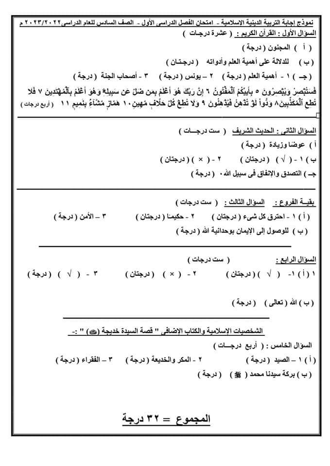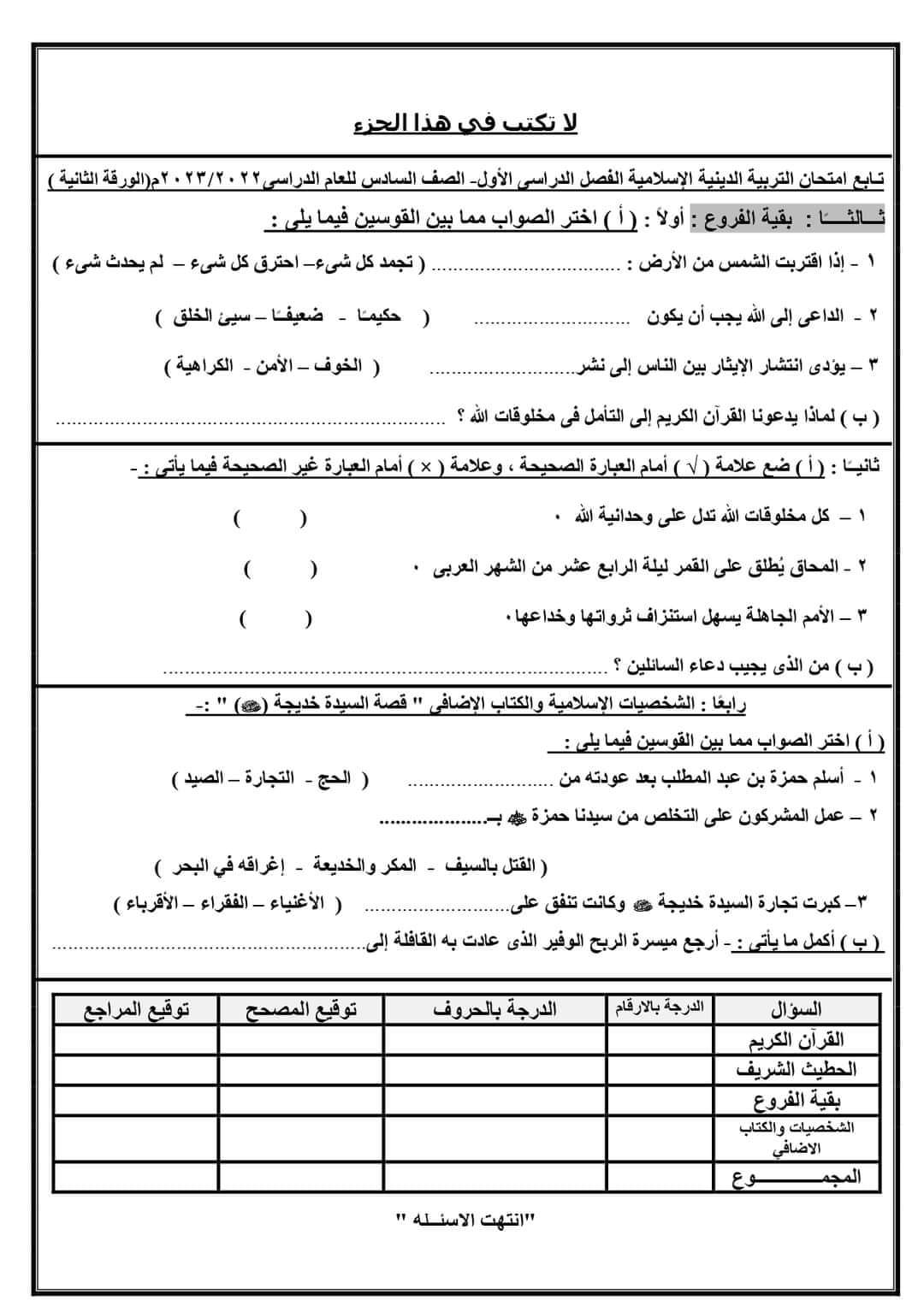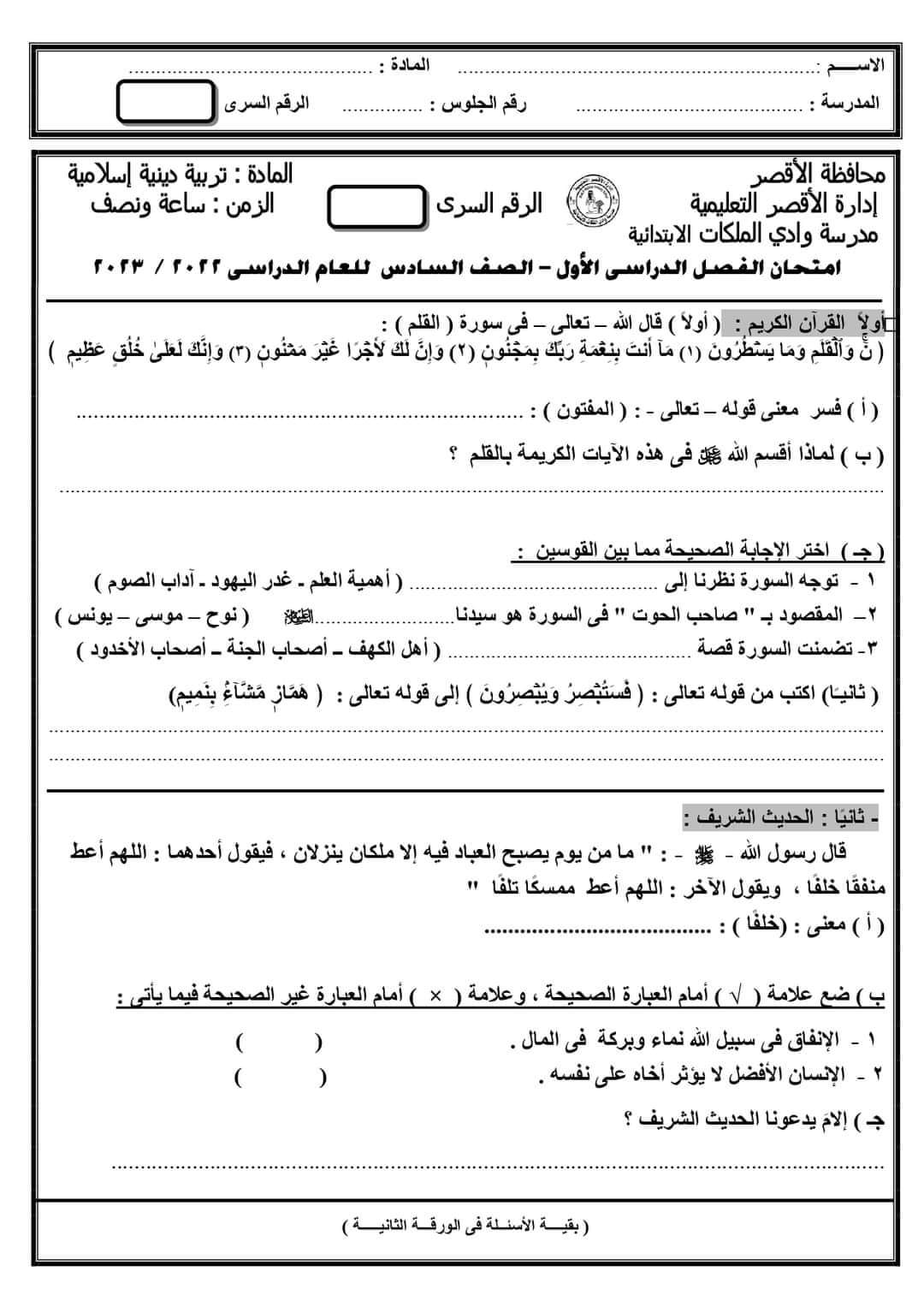 تحميل امتحان توجيه الأقصر التربية الدينية الاسلامية الصف السادس الابتدائي الترم الاول 2023 بالاجابات