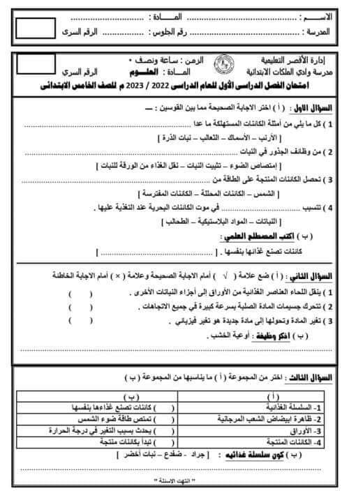 تحميل امتحان توجيه الأقصر العلوم الصف الخامس الابتدائي الترم الاول 2023 بالاجابات