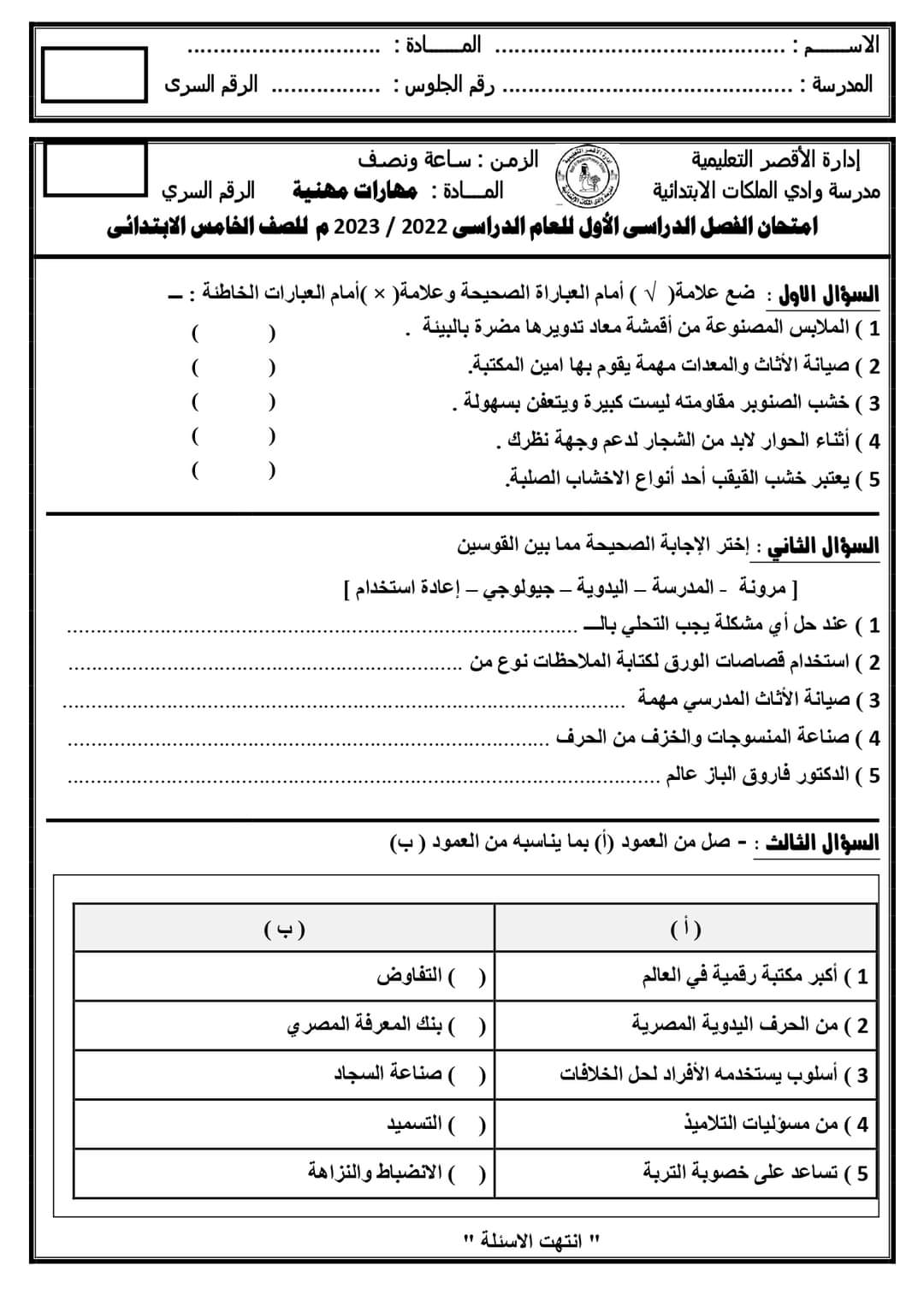 امتحان توجيه الأقصر مهارات مهنية الصف الخامس الابتدائي الترم الاول 2023 بالاجابات