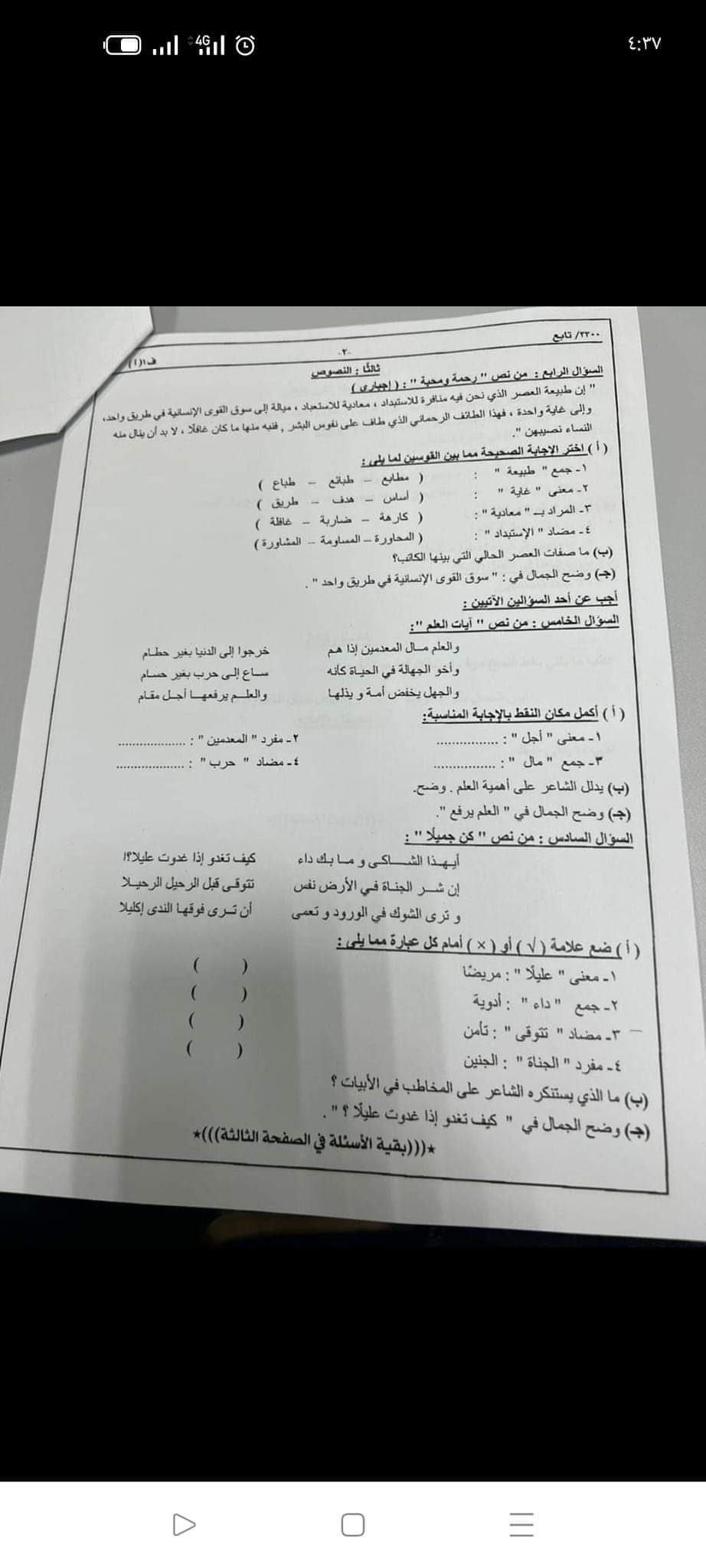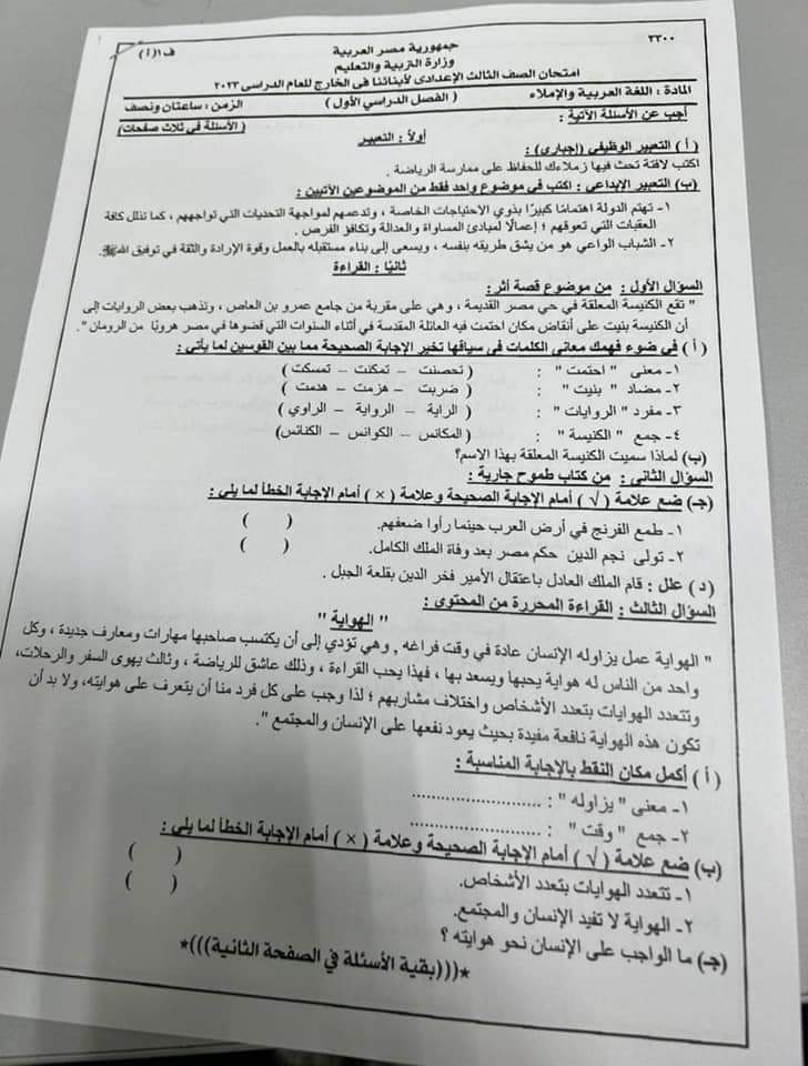 تحميل امتحان اللغة العربية أبنائنا فى الخارج الصف الثالث الاعدادي الترم الاول 2023