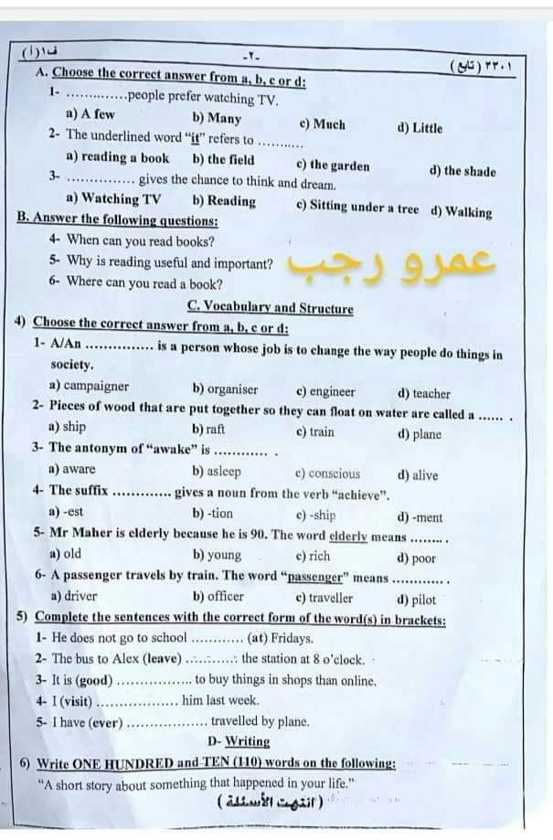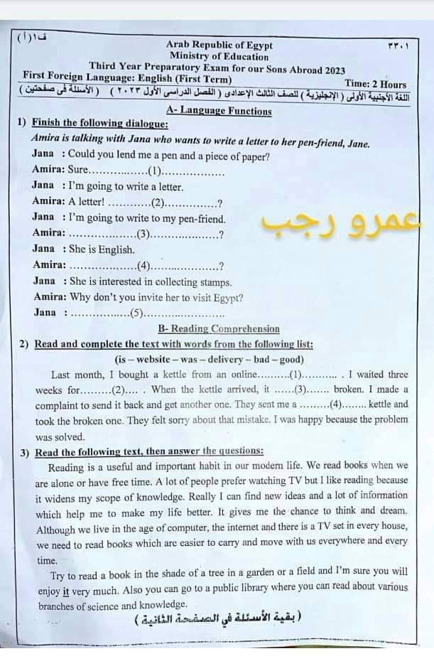 تحميل امتحان اللغة الانجليزية أبنائنا فى الخارج الصف الثالث الاعدادي الترم الاول 2023