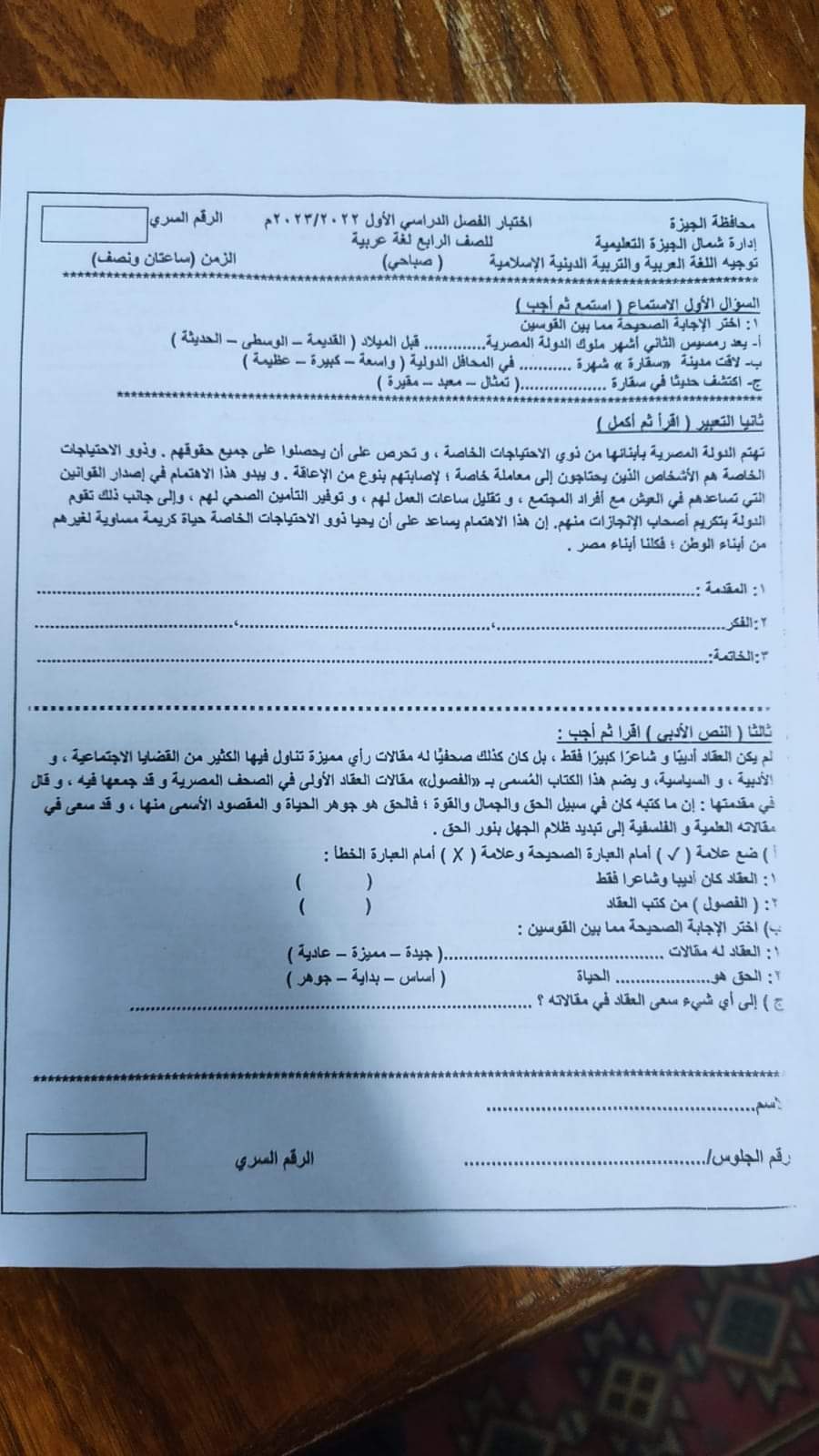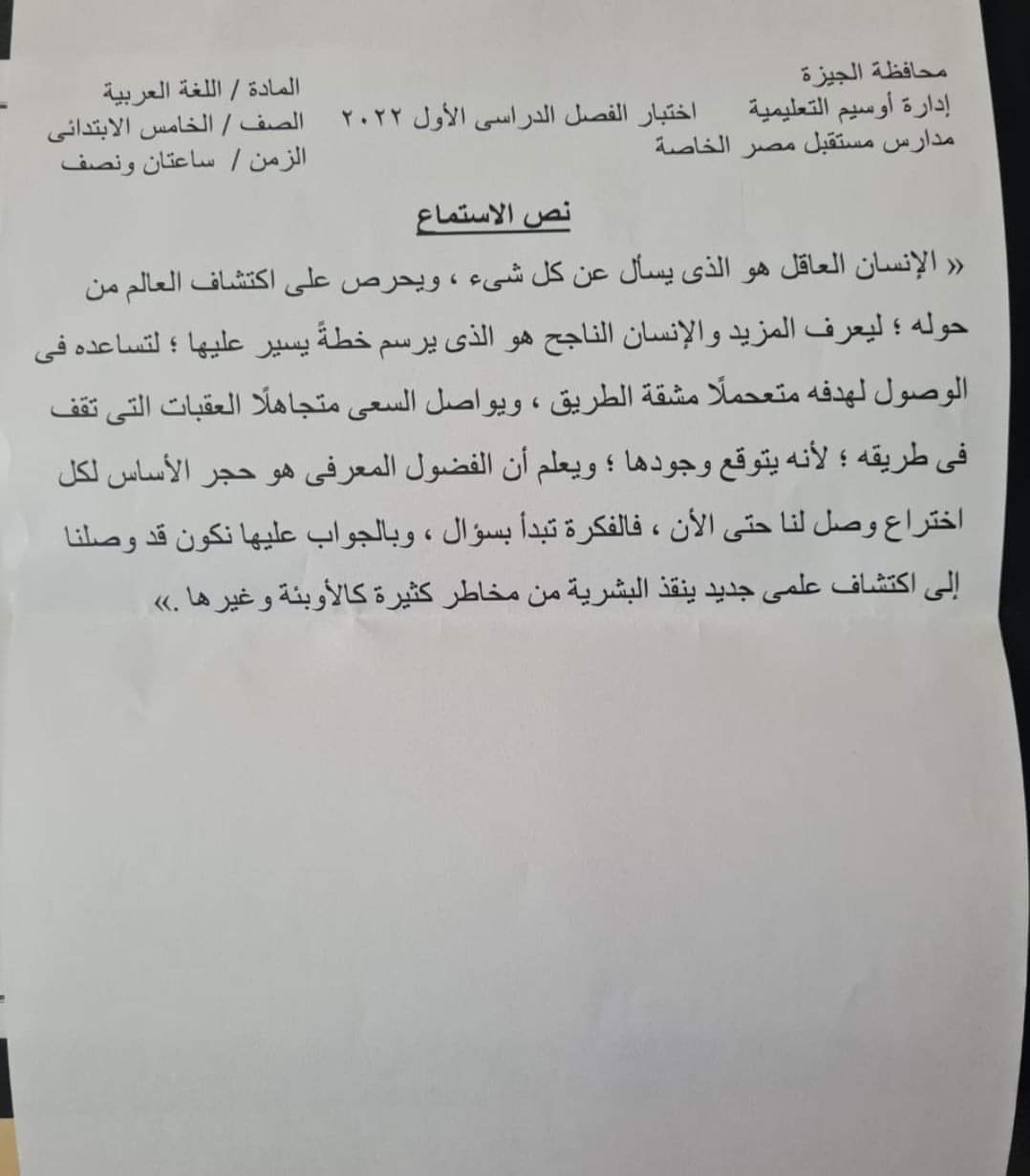 امتحان اللغة العربية محافظة الجيزة الصف الرابع والخامس الابتدائي الترم الاول 2023